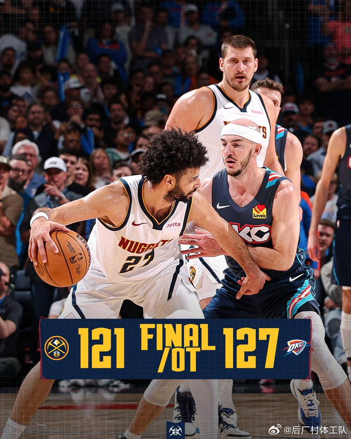 雷霆加时127-121战胜掘金,亚历山大复出得到36分3板9助2断2帽,霍姆格伦15分21板3助3帽;掘金方面穆雷空砍穆雷39分8板6助2断,约基奇23分17板14助、布劳恩23分8板2助2帽、小哈达威16分2板1助。