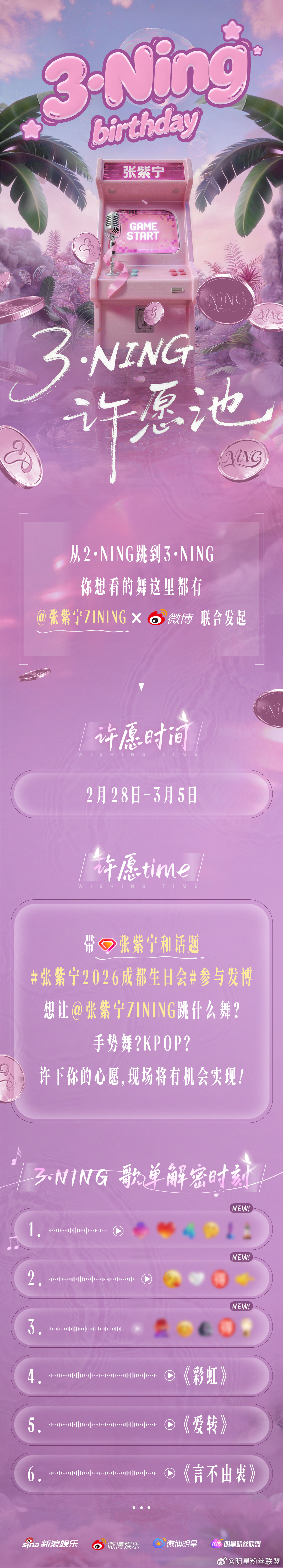 张紫宁2026成都生日会 三重惊喜提前预告:舞蹈由你们许愿,歌单为你们解密,新歌舞台首度呈现。这一次的「3·Ning」现场,不止是演出,更是一场双向奔赴的仪式。