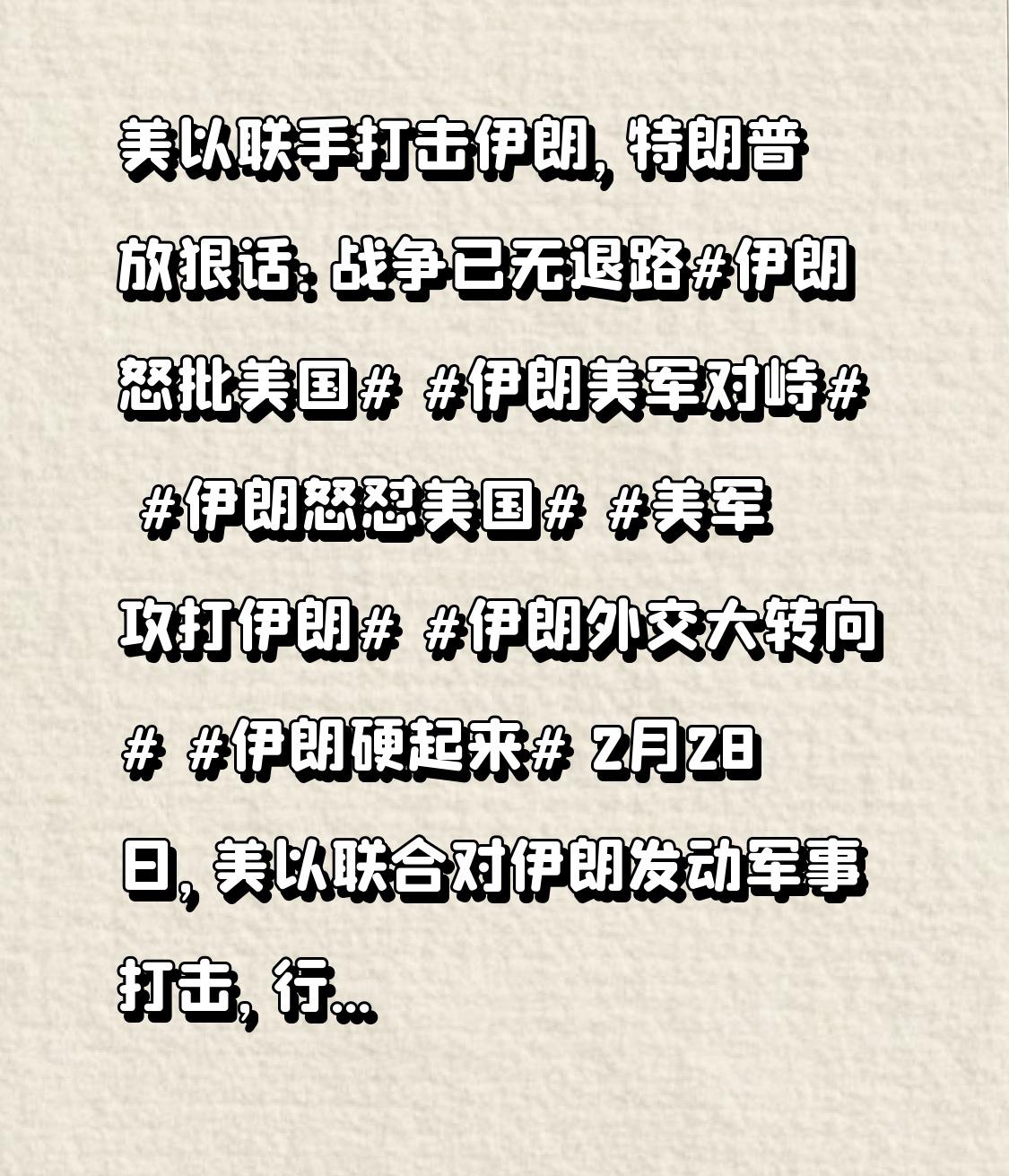 美以联手打击伊朗,特朗普放狠话:战争已无退路 伊朗怒批美国 伊朗美军对峙 伊朗怒怼美国 美军攻打伊朗 伊朗外交大转向 伊朗硬起来 2月28日,美以联合对伊朗发动军事打击,行动将持续数日。特朗普发表8分钟视频讲话,宣布展开大规模作战,称伊朗长期支持恐怖活动、威胁美国安全,因伊朗拒绝放弃核与导弹计划,美方“不再容忍”。 特朗普明确目标:摧毁伊朗导弹工业、消灭海军,阻止其获得核武器,并要求伊朗革命卫队放下武器,喊话伊朗民众“行动后接管政府”。他承认战事可能造成美军伤亡,但强调这是为国家安全必须承担的代价。 伊朗多地遭袭,官方表态强硬,誓言毁灭性报复。中东局势全面失控,地缘冲突急剧升级,全球能源与安全格局面临剧烈震荡。美国对伊朗开战 伊朗怒批美国 美国对伊朗开战