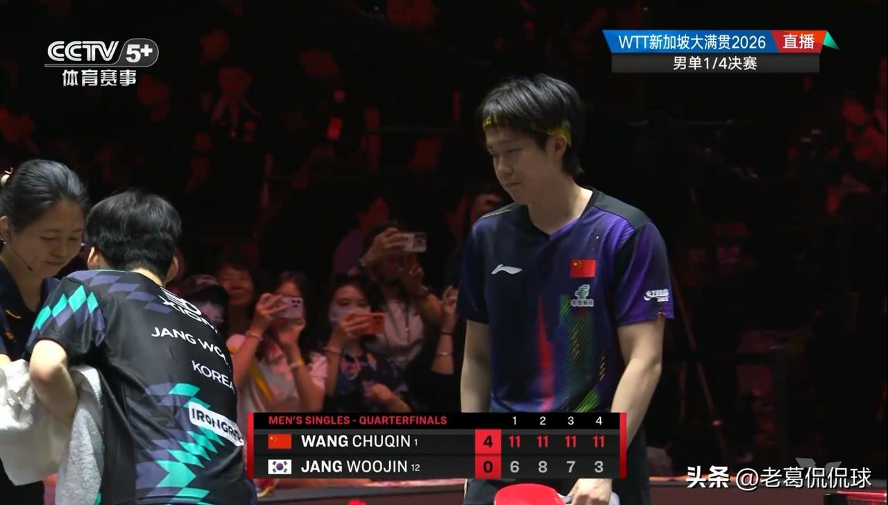 下面是一条关于中国男乒名将王楚钦的好消息!在刚刚结束的一场世乒联大满贯新加坡站男单1/4决赛中,中国选手王楚钦以4:0完胜韩国选手张禹珍,顺利晋级本届赛事的男单半决赛。 实事求是的说,本场比赛王楚钦赢得相当轻松,王楚钦没有给张禹珍留下任何的赢球机会。期待王楚钦能够在接下来的比赛中延续自己的出色表现,接下来的半决赛对于王楚钦来说将是一场恶战,王楚钦将会迎战法国选手小勒布伦,小勒布伦在1/4决赛中击败了另一位中国名将林诗栋。