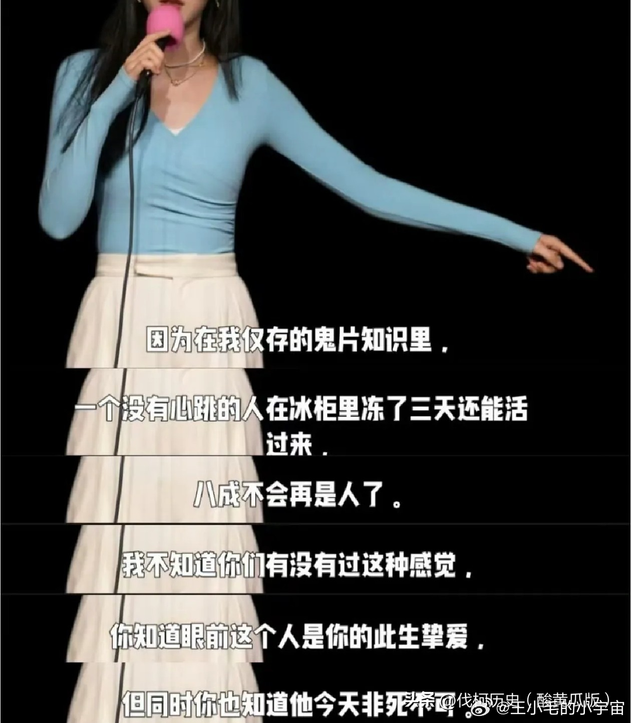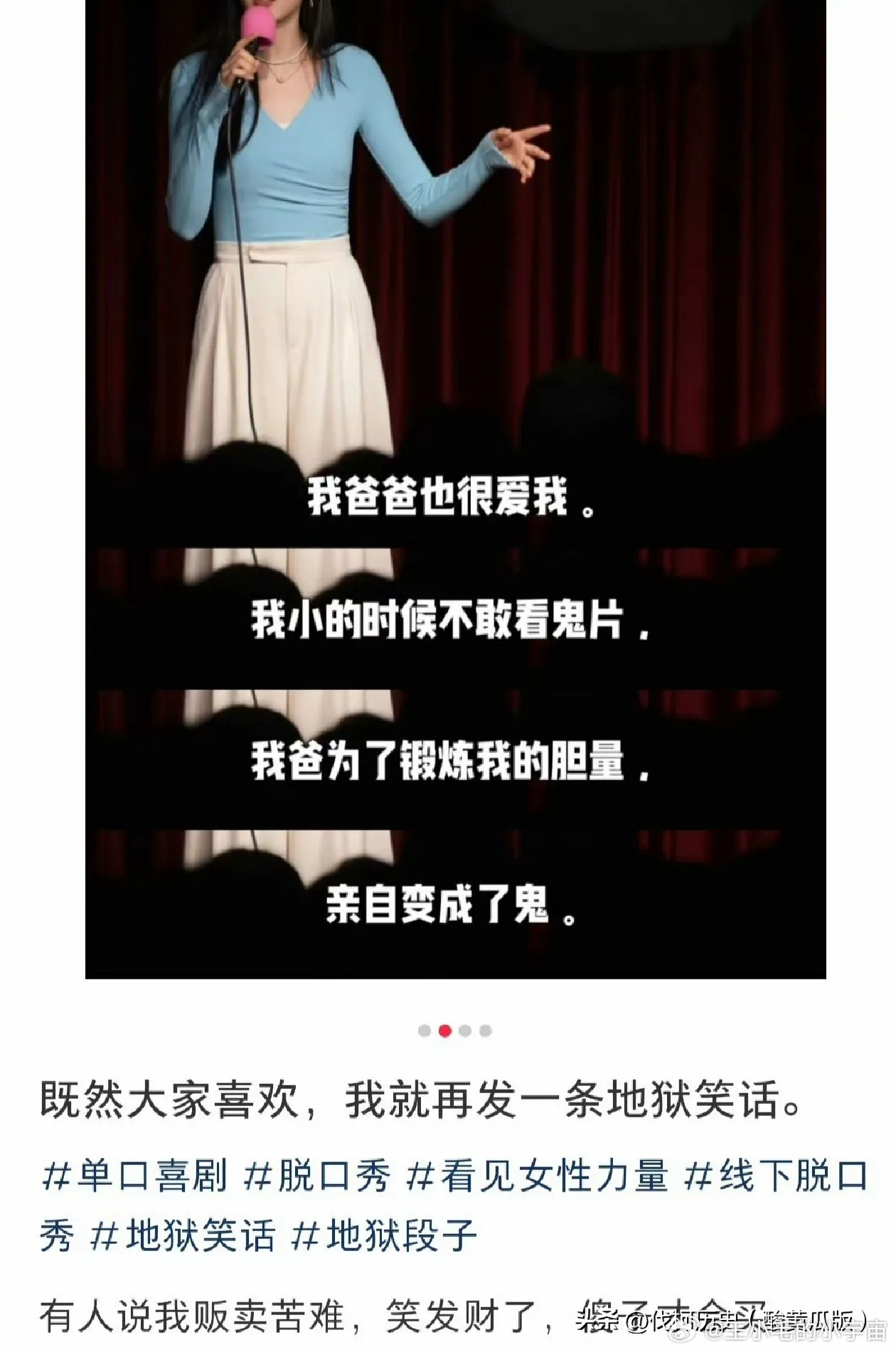最近某个脱口秀女演员挺火呀,大家先看看他讲啥内容吧。我现在已经不想讨论他是否有文化了,他是否适合从事文化工作者这一行业。我只想知道这个女演员有骑马的道德和伦理的底线吗?拿逝去的父亲在那秀。在那开涮。好笑吗?
