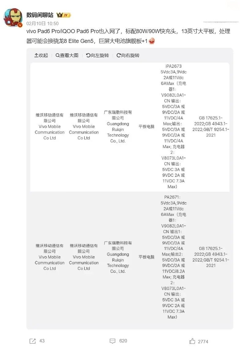 vivo 本月入网了两款平板电脑,数码闲聊站称新品分别为 vivo Pad6 Pro 和 iQOO Pad6 Pro,标配 80W/90W 快充头,13 英寸大平板,处理器可能会换骁龙 8 Elite Gen5,巨屏大电池旗舰板 +1。