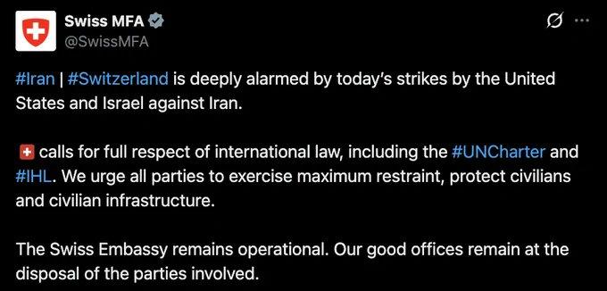 瑞士外交部发表声明,表示对美国和以色列针对伊朗的行动"深感震惊",并呼吁各方"充分尊重国际法,包括《联合国宪章》及国际人道法"。