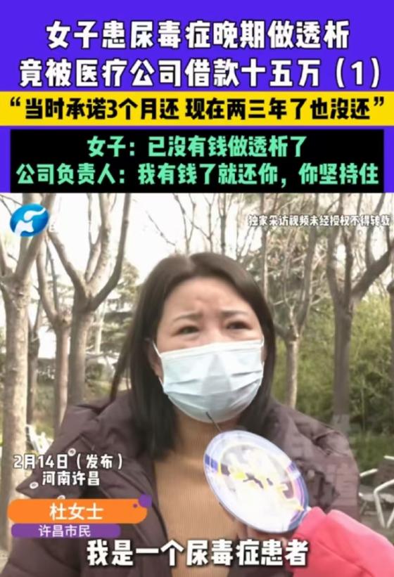 河南许昌,女子得了尿毒症,做透析时认识了医院合作公司人员,对方借走她15万,承诺3个月归还,3年过去了,女子已经到了晚期急需换肾,可对方借她的钱迟迟不还。女子多次找她要钱,对方称:我有钱了就还你,你坚持住! 杜女士跟尿毒症缠斗了八年,透析成了生活节奏,日子虽然挤巴巴地过,但她死死攒下的15万块钱,是要用来保命换肾的。 偏巧就在医院里,认识了号称医院合作公司人员。 说着要“购买耗材临时周转”,又拍胸脯保证“三个月归还”。 有抵押、有协议,甚至机器都押上了。细节处处滴水不漏。 就这样,杜女士对着账本比了又比,咬咬牙,忍着心里的不安,把救命钱递出去。 这一递,说白了,是把最后的底线全托付给了面前这个看似“靠谱”的人。 但笔落协议,转头就是江湖。三个月眨眼过去,杜女士的汇款提醒还是静悄悄。 那15万消失在医疗器械的世界里,没有一丁点回音。 再三拨电话去问,那位工作人员的答复,基本都是那句“你坚持住”,她没有多讲一句,仿佛只要杜女士不死,欠钱就不是事。 等到三年过去,杜女士已经到了换肾的生死线上。 满世界筹钱,凑不齐手术费,只好硬着头皮再去要债,谁承想甩回来的居然是一句“前几天不是还你两百了吗”,这点小钱像给乞丐发施舍。 这位工作人员的形象在这一事件里格外突出,她给人本能的信任感,和现实生活的压迫感搅作一团。 杜女士的“救命钱”不是被抢劫,而是自己双手递出去,被一连串令人心动的承诺牵着鼻子走。 等承诺成空,生活如陷深渊,那些当初让人相信一切的词句都成了今天的自我挖苦。 这样的设陷,不限于河南,也不限于这个岗位。 很多家庭在面对急病、求学,往往甘愿信赖身边熟人、权威的医生老师、老乡朋友。 等到被骗,只能自己叹口气。归根结底,身边信任的那面旗,最容易被用来挡住你的眼睛。 眼下经济环境并不宽裕,像杜女士这种靠自己小心翼翼攒钱的家庭,实在经不住一次“相信错了人”的代价。 最怕的不是被骗,是被骗之后还有一堆人劝你“想开点,别执着”。很难不让人生出一点无力感。 大多数人其实离这种事并不遥远,不同的是,有人被骗一笔还能爬起来,有人被骗一回,直接陷进无穷痛苦再无翻身之机。 无论古今中外,善良有时候是最扎心的弱点,但没了善良,这个世界也不会明朗多少。 所以人得学会给自己的善良戴把锁,不是处处提防,但起码得留点后路。否则,谁还敢随便信人一回? 不少网友感慨:现在社会,只要手里没点硬杠杠的证据和后盾,欠钱不还的事就像家常便饭。 谁更强谁说了算。这种话听着糟心,却不是没道理。 公平公正,只有被一次次践踏后,才会让普通人学得更谨慎。 有人说杜女士太傻,没仔细考察对方的偿付能力。可谁不是在关键当口,希望抓住一点“人情世故”的温度? 所以,穿过这个故事,看到的不止是个人的信任危机,更是一群被困在命运和规则夹缝里的人。 每一个经历磨难的人,会对“救命钱”这三个字生出格外厚重的感情。可惜,遇上了冷漠和算计,所有的热血都慢慢温凉。 回到现实里,法律当然是底线,但套路、权力和人心之间的博弈,远比纸面上的判决复杂太多。 愿这个故事最后,杜女士至少能安安心心地过自己剩下的日子。 信息来源:尿毒症患者透析8年,称三年前在医院科室被借款15万元至今未还?许昌中医院发布情况说明:不存在对外承包科室的情形——2026-02-16 16:43·鲁网