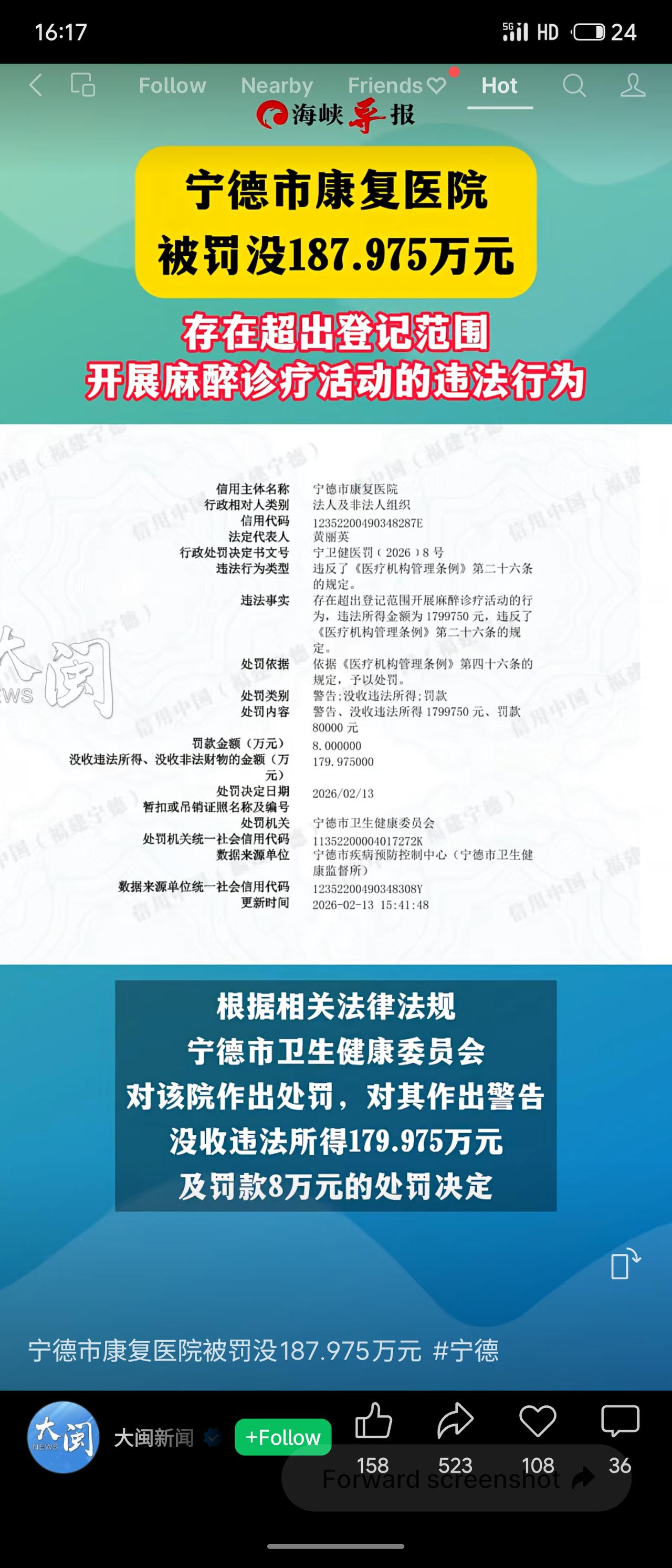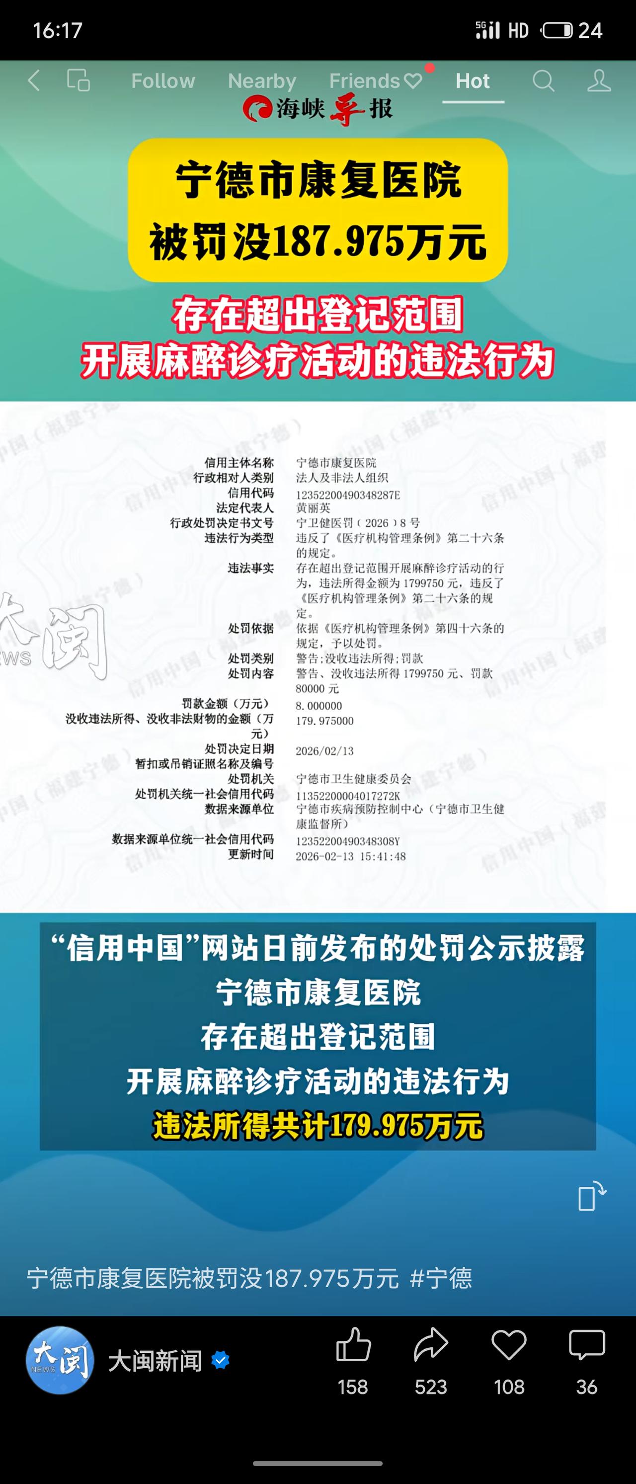 宁德市康复医院因超范围开展麻醉诊疗,被卫健部门警告、没收违法所得179.975万元并罚款8万元,罚没合计近188万元。 此案暴露部分公立医院在利益驱动下违规执业,试图钻空子牟利。此类行为不仅危害患者安全,更严重损害医疗公信力。监管部门果断“亮剑”,是对越界者的一次严肃警示。