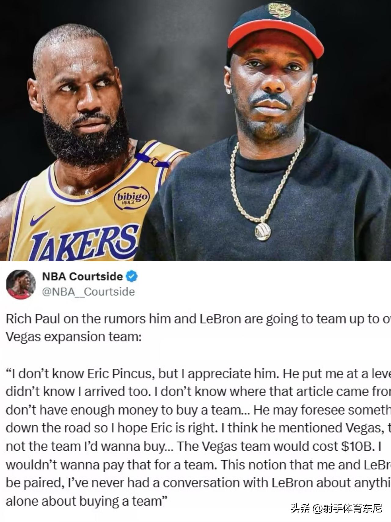 里奇-保罗联手詹姆斯欲购买NBA新球队?NO!纯属谣言!听听富保罗怎么说? 里奇-保罗:“我不认识Eric Pincus,但我得谢谢他。他把我抬到了一个连我自己都不知道已经达到的高度。我不知道那篇报道从那里来的….. 事实上我根本没有那么多钱购买球队。也许他是预见了未来会发生什么,所以我希望他是对的。至于说我和詹姆斯联手收购球队,我和詹姆斯从未聊过这方面的问题,更别说购买球队了。”