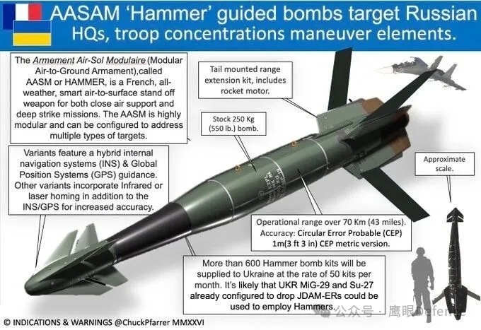 “铁锤”是一款优秀制导炸弹,有多种可更换导引头,抗干扰能力极强,圆概率误差(CEP)仅为1米,安装有火箭发动机,最大射程超过70千米,尽管在乌克兰战场上无法发挥最大射程优势,也对乌克兰空军具备极大意义。