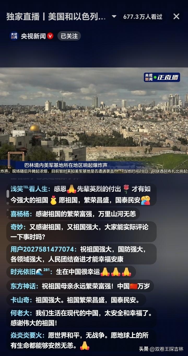 何其有幸生在华夏! 美国和以色列真不想让伊朗过安生日子,又开始发射炮弹袭击伊朗。 不但袭击伊朗首都德黑兰,核设施集中地,还有库姆、卡拉杰、克尔曼沙赫等多个城市。 美国参与其中,将此次行动命名为“史诗怒火” 。他们想载入史册“浪漫”的怒火,就是炮弹射程中无比恐怖的噩梦。 央视新闻独家直播美国和以色列袭击伊朗直播,虽然炮声已经结束,但是城市不知如何会迎接第二轮袭击,这种未知的紧张气氛更令人心惊肉跳。 此刻,真为生在中国感到幸福。也愿世界和平,人们安居乐业。