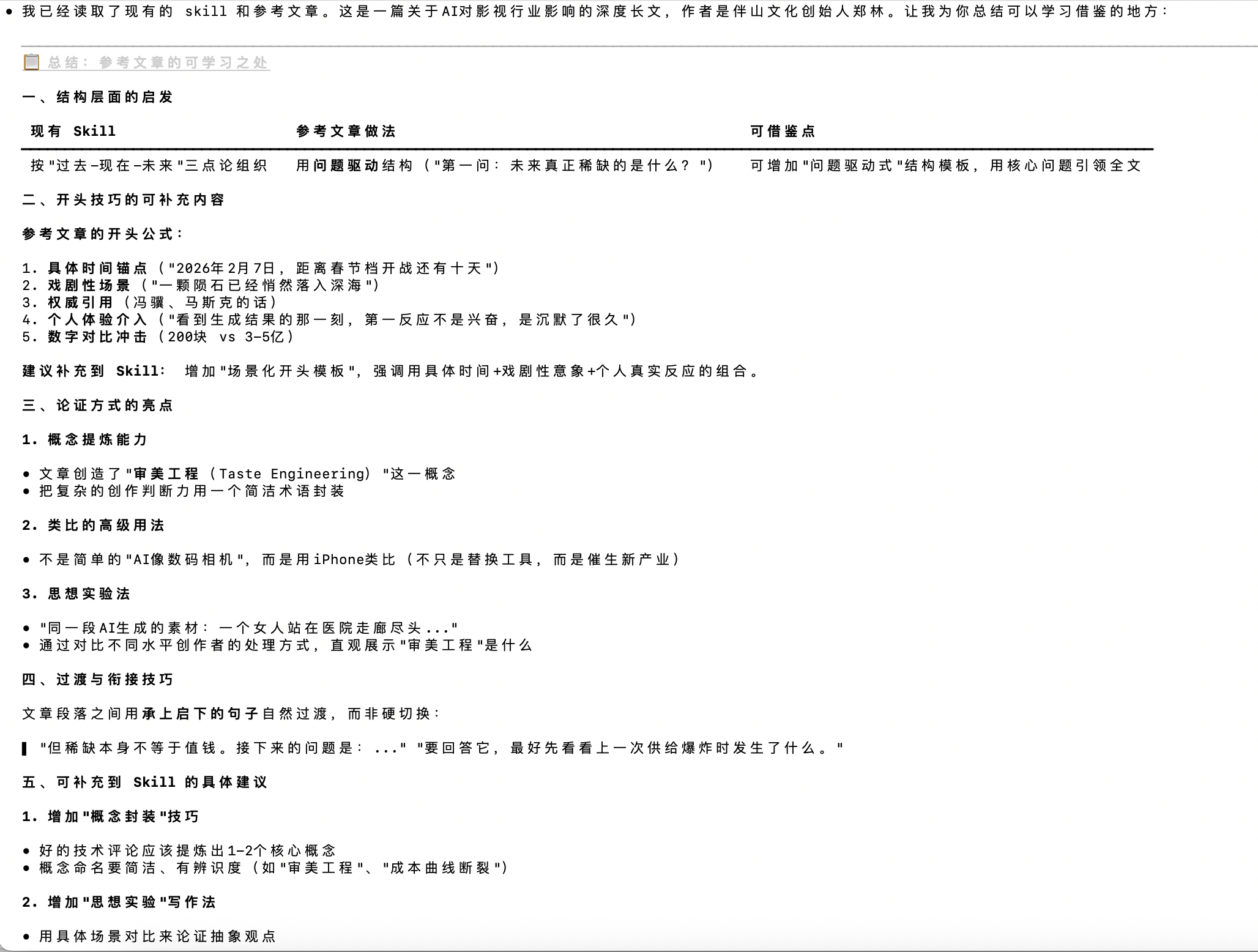 现在看到一篇好文章,就让 AI 总结学习一下,放到写作 skills 里去。