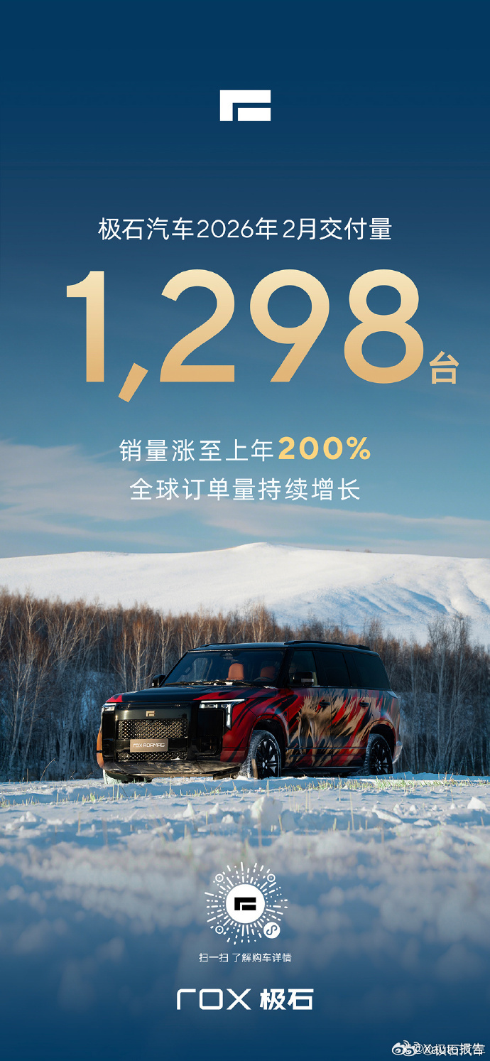 2月28日,极石汽车发布,2026年2月交付1298台,销量涨至上年200%,全球订单量持续增长! 汽场全开极石01