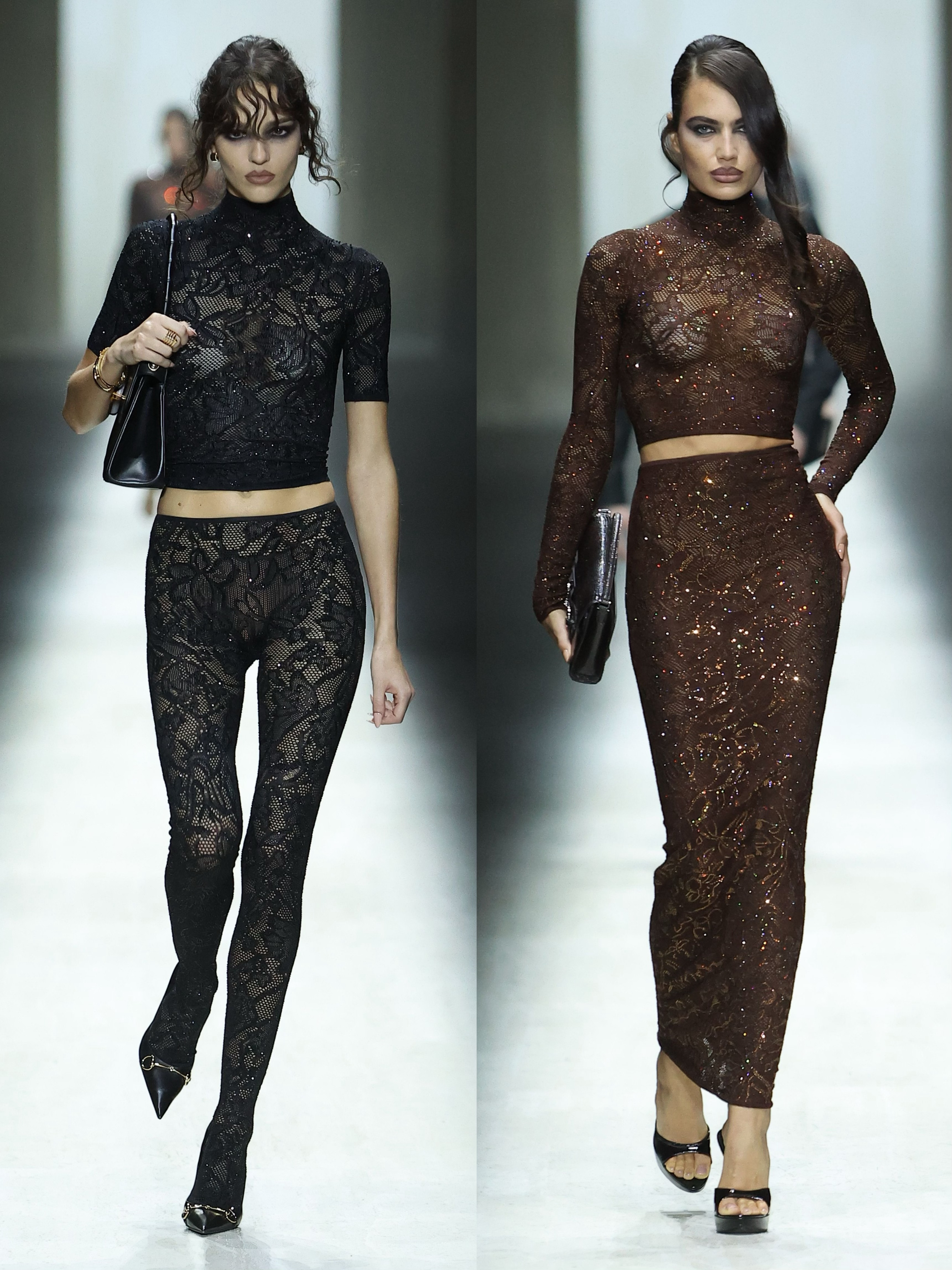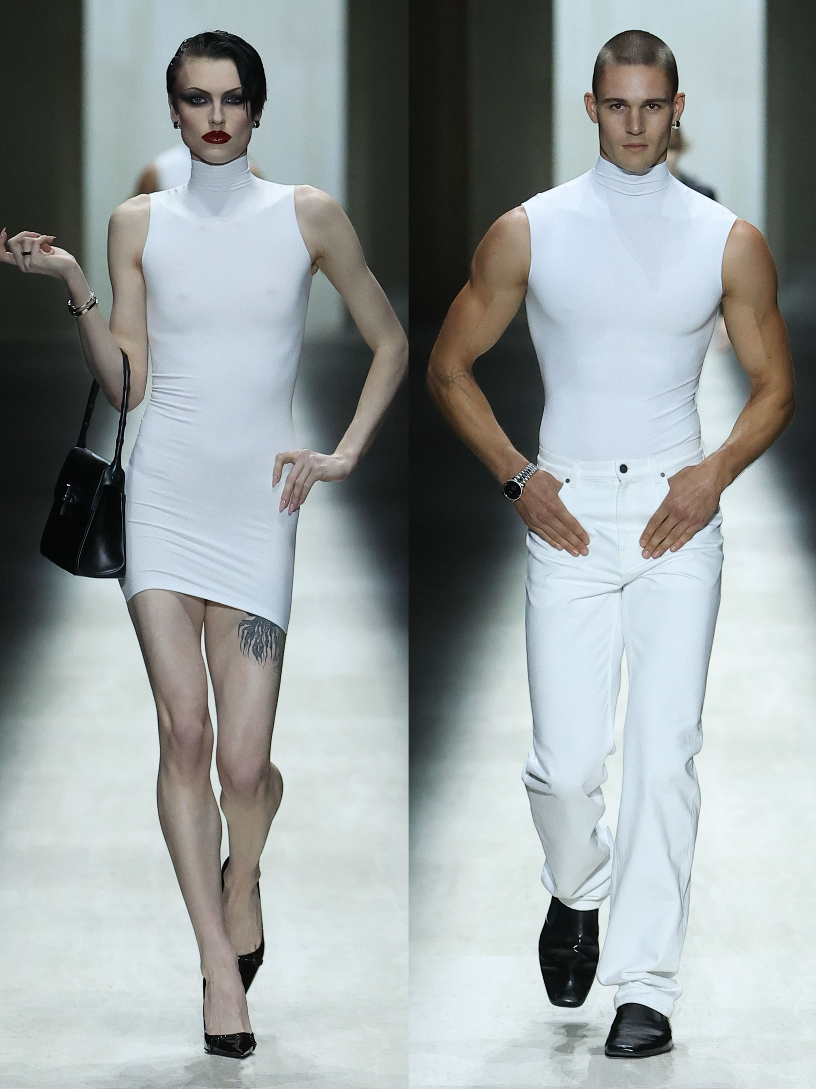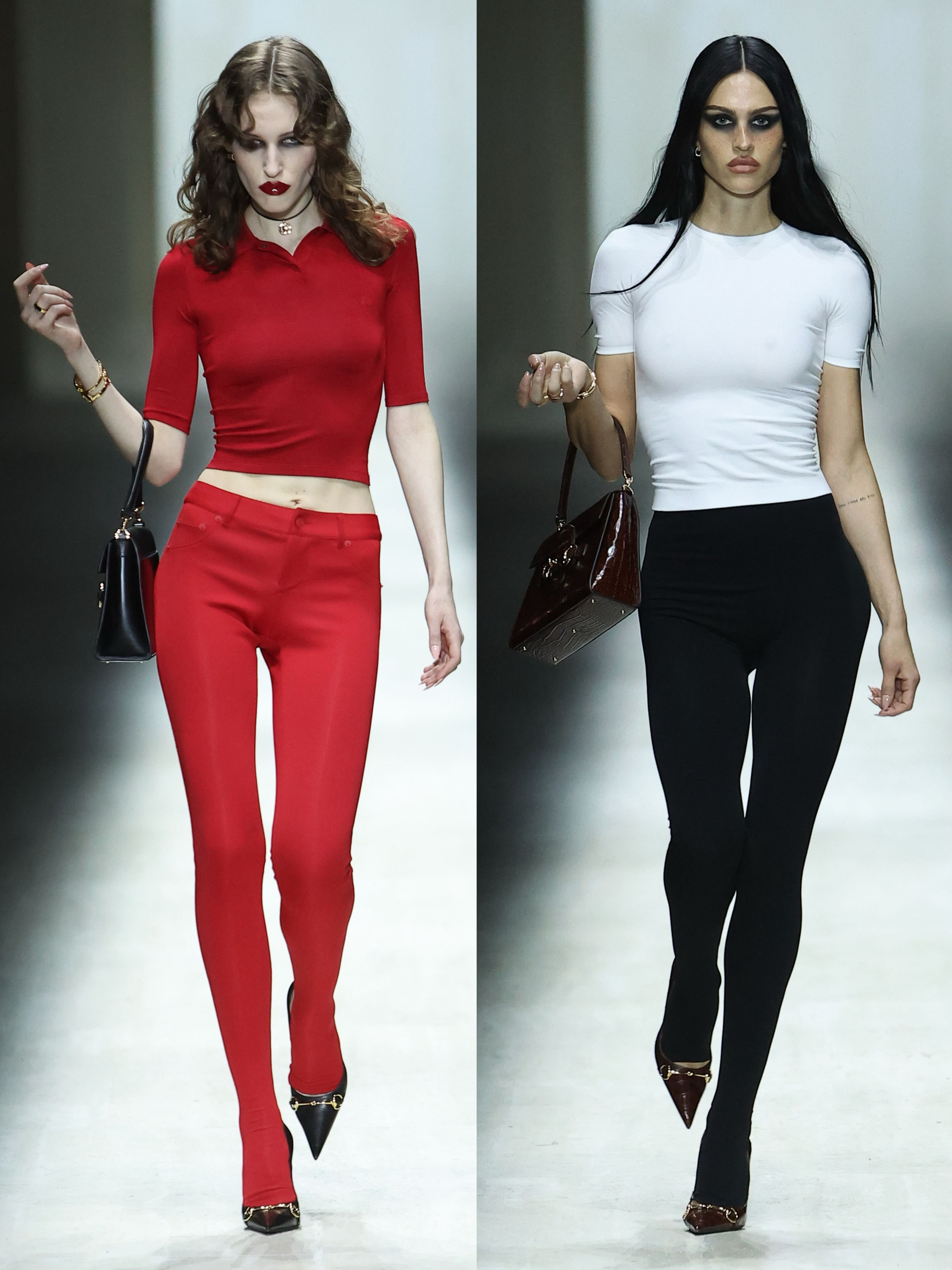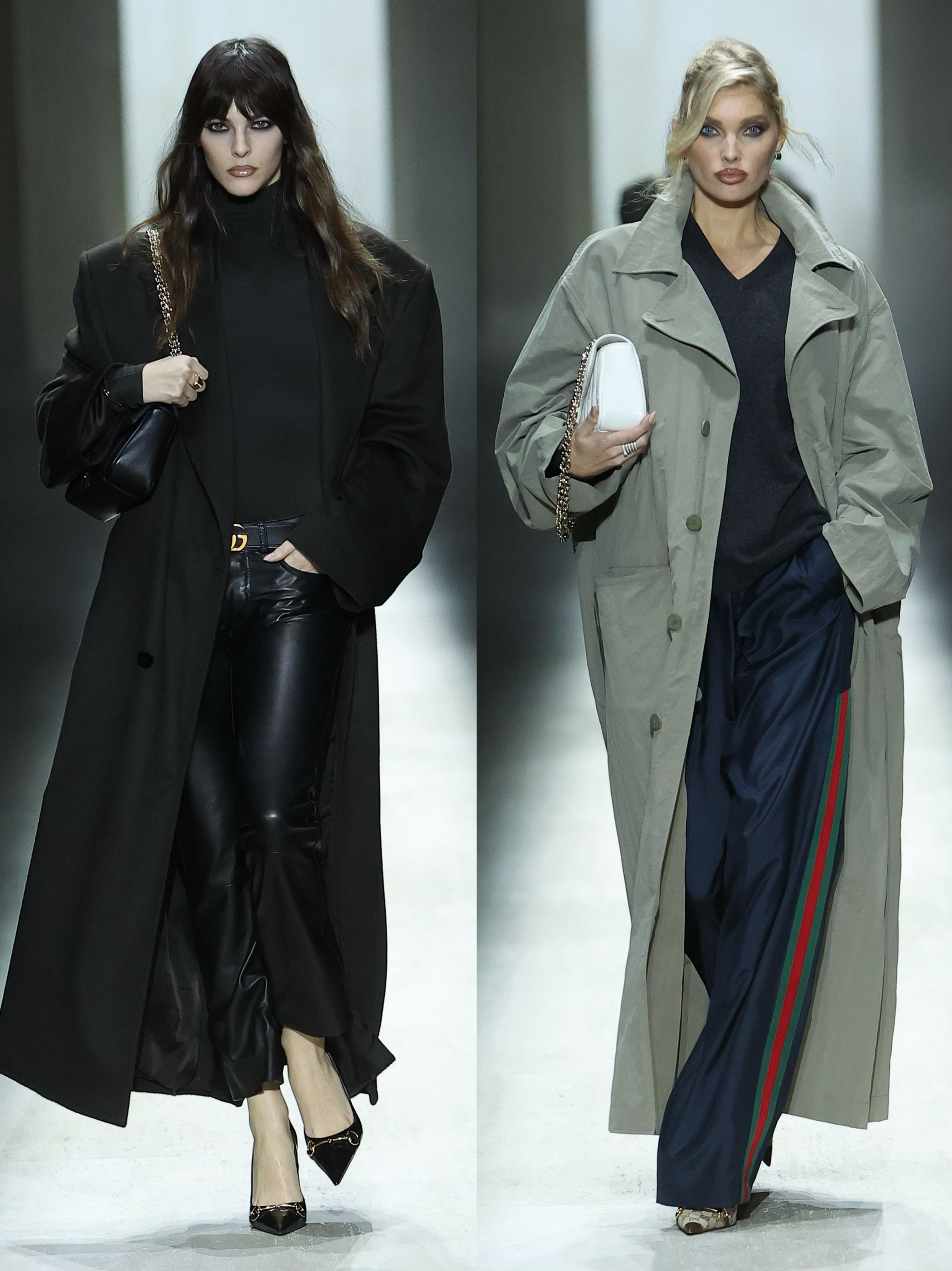 🍃🌸该系列共包含83套造型,男女皆宜。T台上,女士们身着细高跟鞋、低腰紧身裤、迷你裙、饰有双G标志的丝袜,以及人造皮草外套或飞行员夹克。男士们则身穿包裹着他们健硕身材的紧身背心,带着颓废的气息,搭配机车夹克和一些超大号的红色或白色皮鞋,部分男士还挎着备受欢迎的Gucci斜挎腰包。凯特·莫斯身着一袭闪亮的黑色晚礼服压轴出场,礼服的露背设计隐约露出饰有金色双G标志的丁字裤。