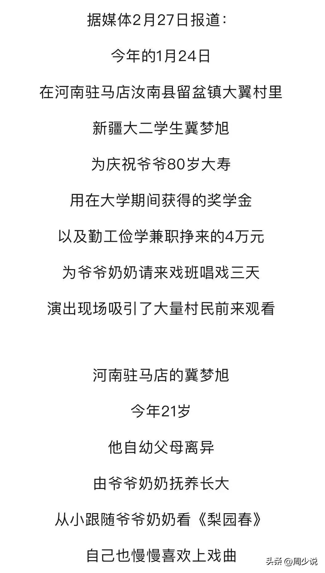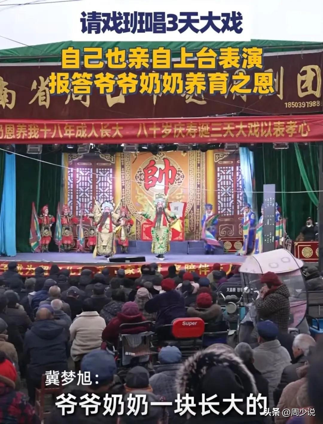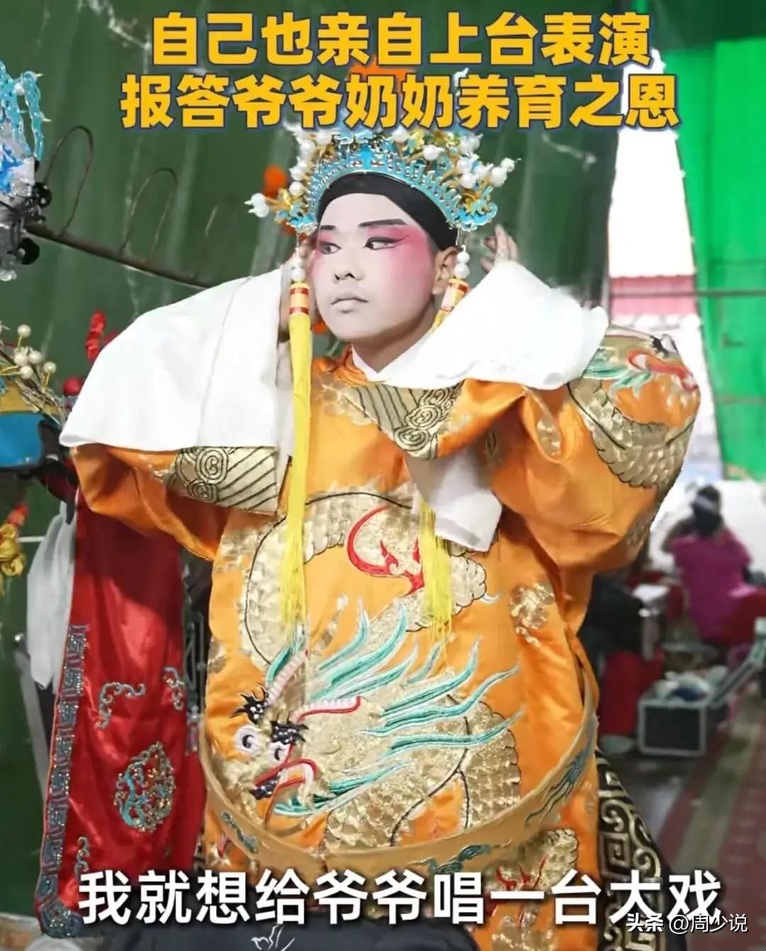 “泪目!”河南驻马店,一位00后大学生火了!在爷爷80岁大寿这天,他悄悄拿出攒了很久的4万元,请戏班连唱三天大戏,自己还换上戏服登台开唱,现场老人笑得合不拢嘴,围观的乡亲们也纷纷红了眼眶。 据悉,这4万块钱,全是孩子自己挣的。一万元国家奖学金,加上平时兼职攒下的积蓄,他一分没舍得花,全都用在了给爷爷祝寿上。更难得的是,他没有专业学过戏曲,只是靠着课余时间跟着视频自学,一点点琢磨唱腔、身段和化妆,哪怕在新疆上学,也从没放下这份爱好。 他把豫剧带上了大学舞台,也把最用心的礼物,送给了养育自己长大的爷爷奶奶。 此事一出,网友们纷纷破防:“现在的孩子能这么惦记长辈,太难得了!”。 还有网友夸赞:“自食其力回报家人,这才是年轻人该有的样子!” 周少想说在不少人眼里,给长辈过生日或许就是吃顿饭、买个礼物,可这个大学生用最朴实、最隆重的方式,诠释了什么是真正的孝顺。他没有喊空洞的口号,而是把感恩落在了实实在在的行动上。 他回报的不只是爷爷奶奶的养育情,更在用自己的方式,提醒着更多在外奔波的年轻人。可见,比起物质上的给予,长辈真正需要的往往是用心的陪伴与惦记。 况且,教育的意义,从来不止是考高分、拿奖学金,更是教会一个人懂得感恩、心存善良、不忘来路。这个年轻人,用自己的选择,给所有人上了生动的一课。 如果你也觉得不错,给这位大学生一个点赞吧!#寻美三湘# #周少说教育#