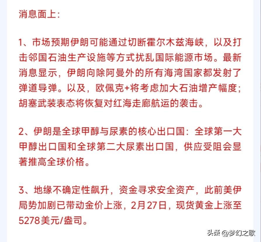 中东地缘政治冲突一起,两大资源,两大化工将面临疯狂涨价,周一相应板块要狂飙 首先,就是黄金和石油这两样资源品,伊朗是世界主要的石油输出国,政治冲突起来出口肯定受到影响,周一石油板块肯定是要上涨的。 而黄金是避险品种,只要冲突来临,资本都会到黄金里面避险,现货黄金肯定要涨。 其次就是两种化工品,伊朗是最大的甲醇出口国和第二大的尿素出口国,这两种化工品短期内也面临涨价的预期,这个周一也要涨。 其实这次重涂影响最大的应该是制造业和科技股,制造业主要的就是石油的影响,而科技股现在主要就是信心的崩塌,钱不会拿来投资,而是会选择避险。