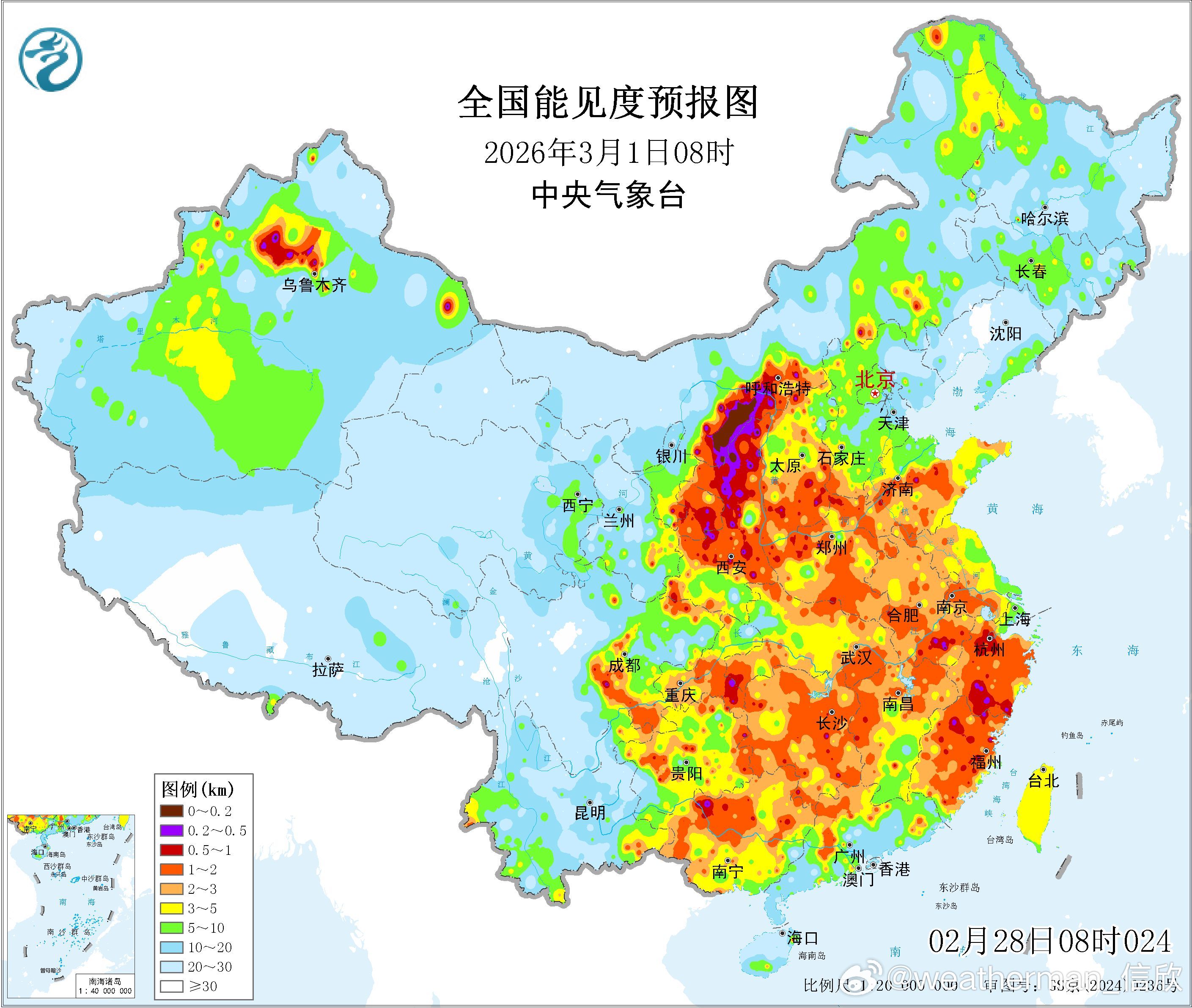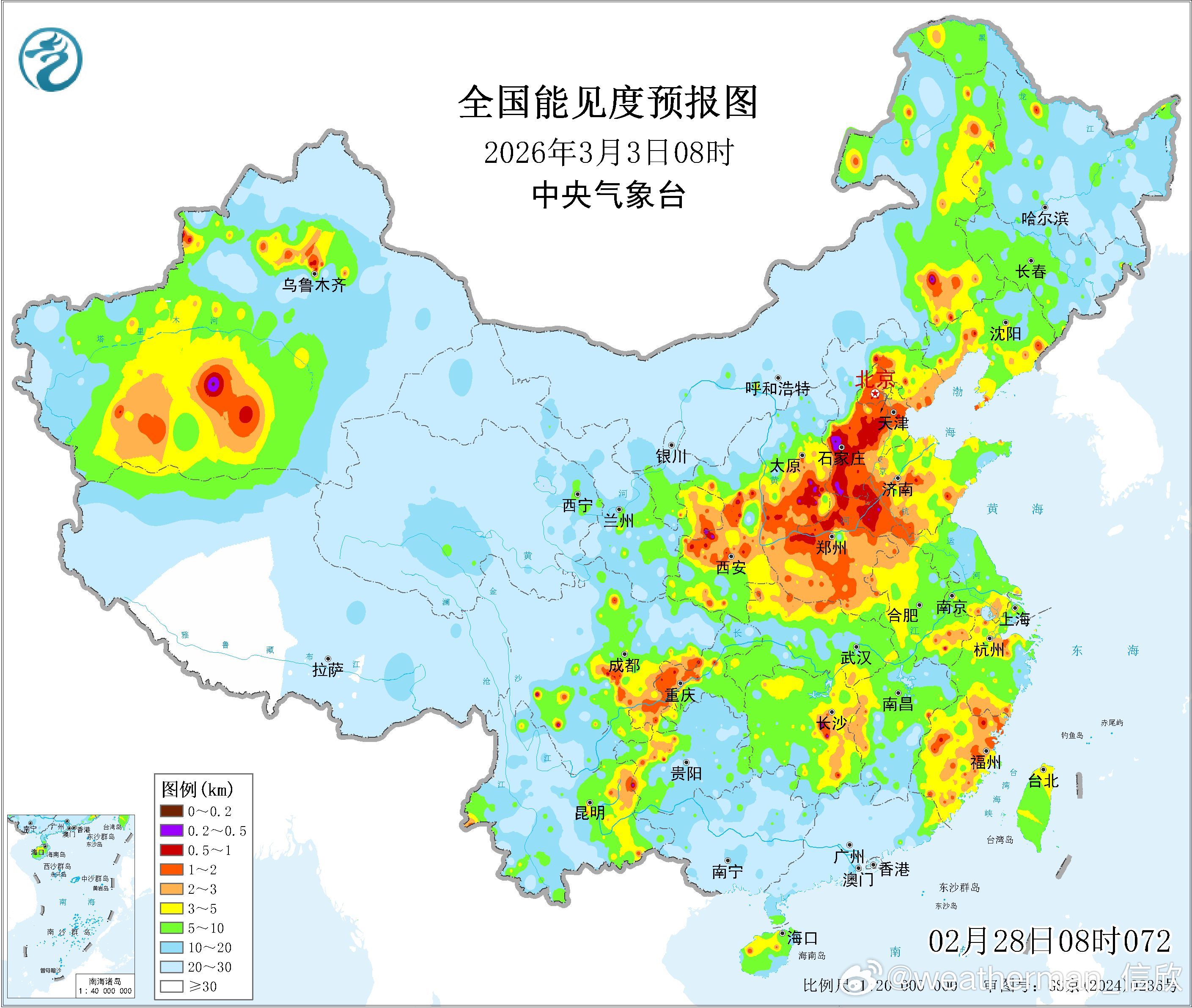 【雾和沙尘】图1-3为数值预报给出的3月1-3日每天8时能见度,图4为官方报的今