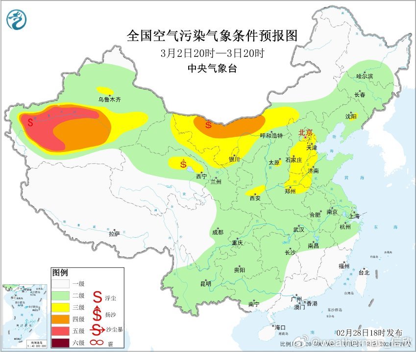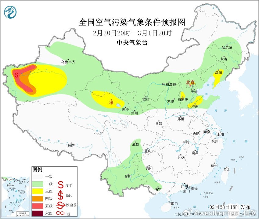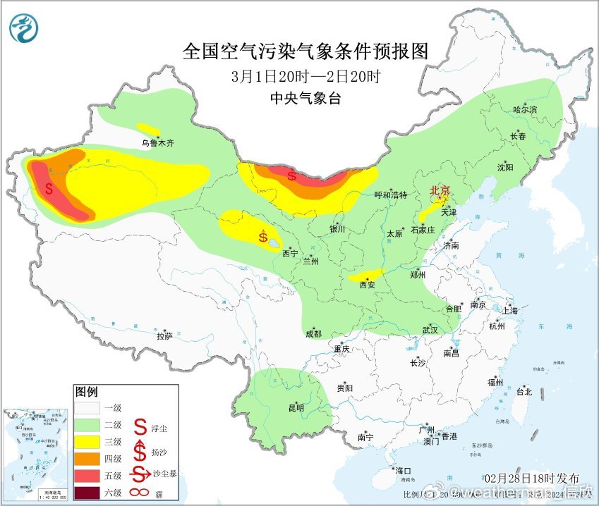另外从空气质量看,新疆塔里木盆地依然还有沙尘污染。明天这样的情况持续,之后还有冷空气回流,沙尘可能再增多。而冷空气主体将东移,蒙古可能还有小低压/气旋活动,导致3月2日至3日,内蒙古中西部、青海北部、甘肃西部、宁夏等地的部分地区将有扬沙或浮尘天气,内蒙古西部偏北地区局地有沙尘暴。