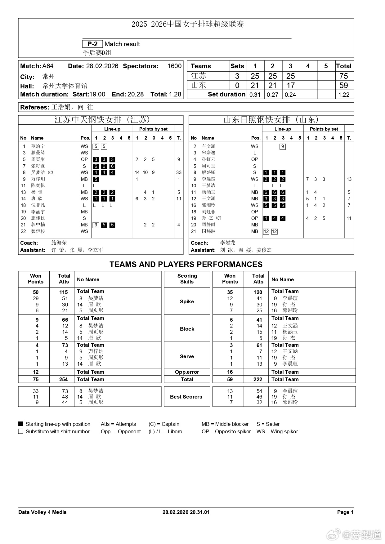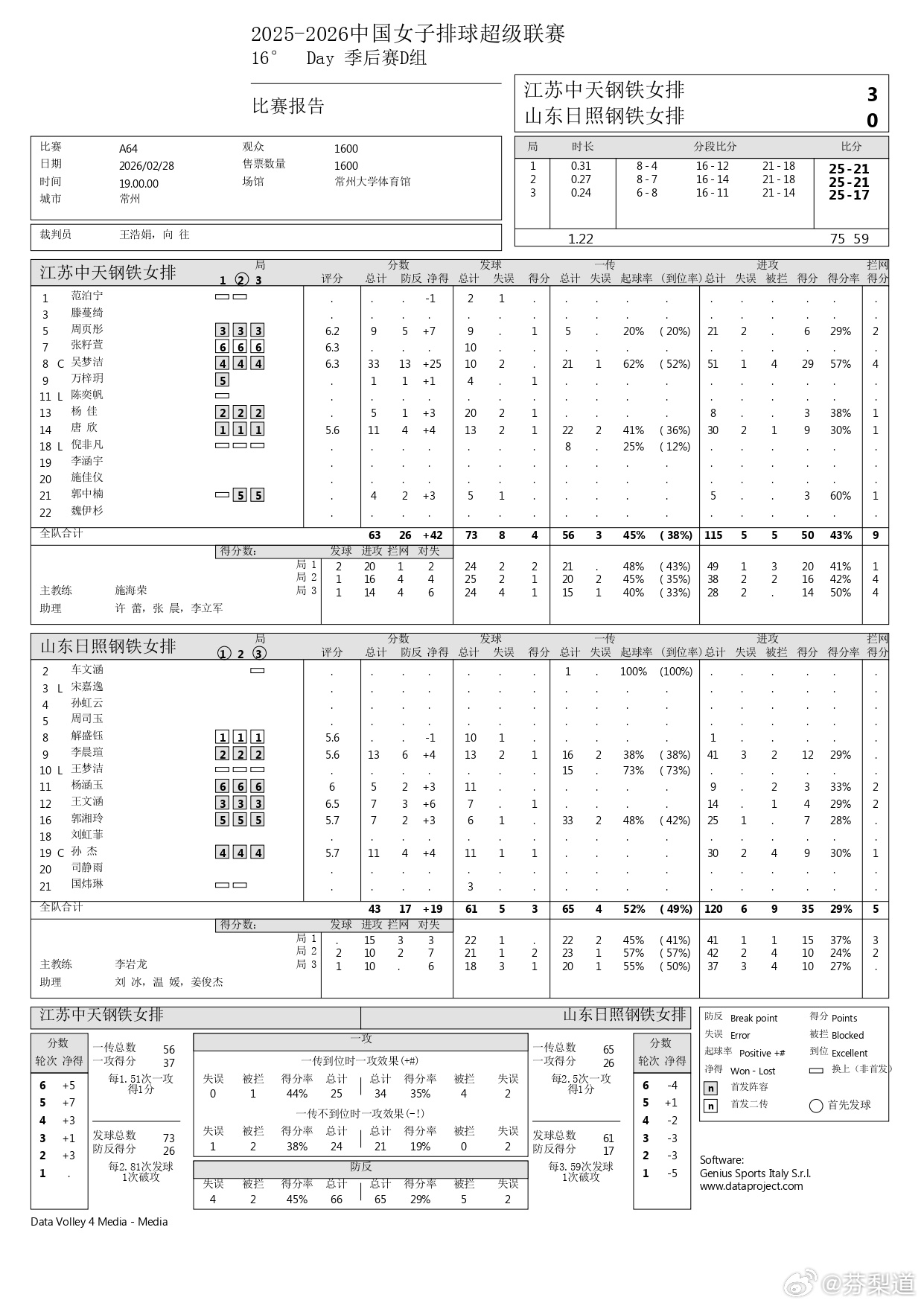吴梦洁排超联赛江苏中天钢铁主场3-0山东日照钢铁 吴梦洁33分 51扣29中1失误4被拦 4拦