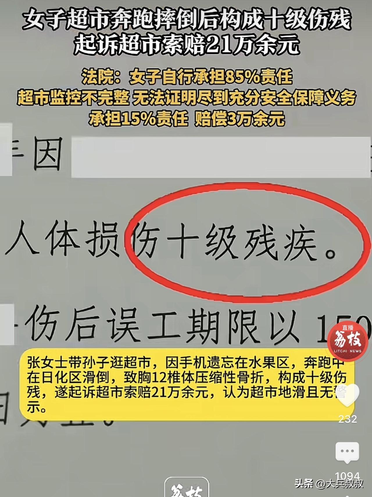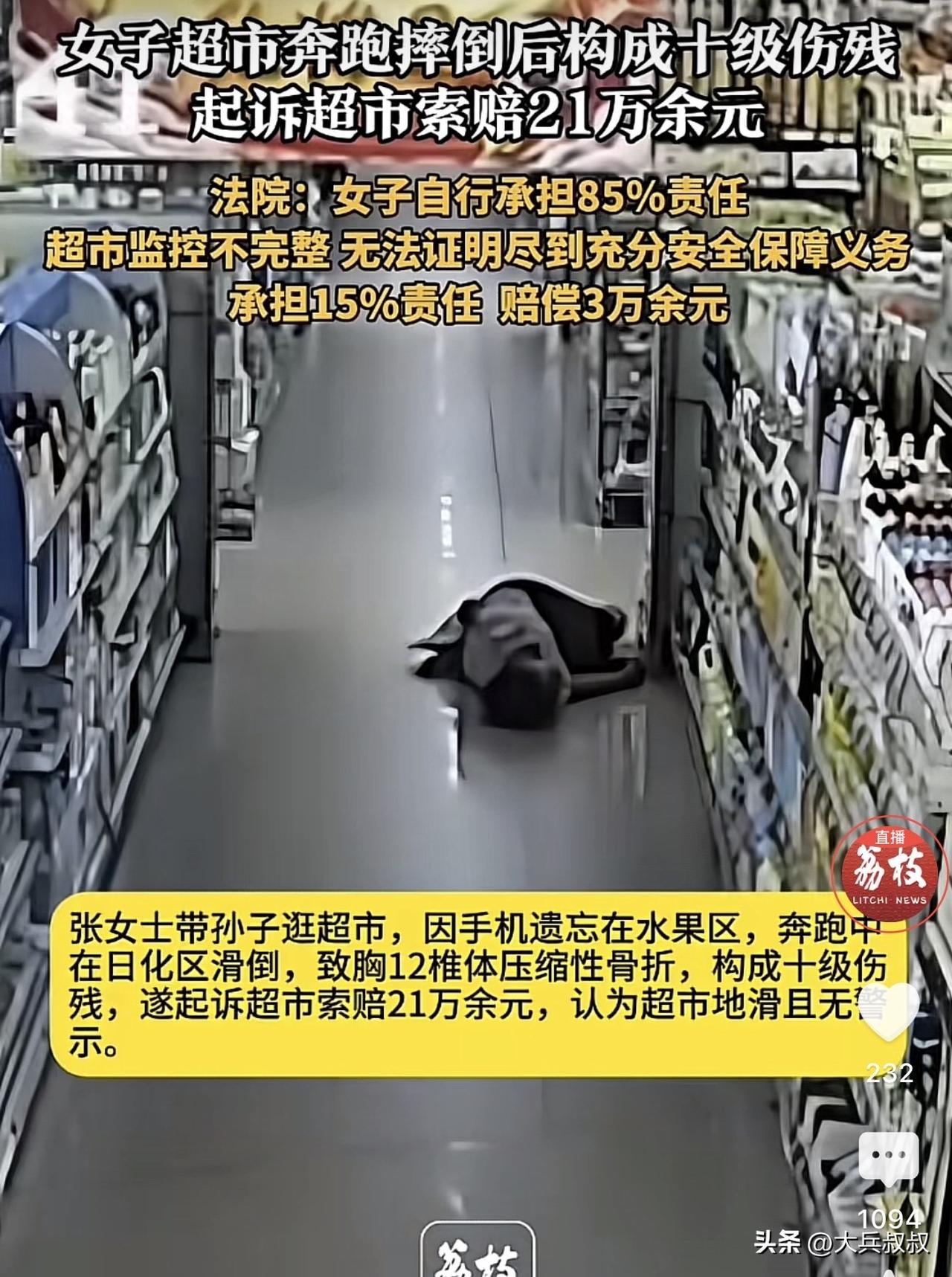 江苏泰兴,一女子带孙子逛超市,因为把手机忘在了水果区,女子急忙奔跑过去拿手机,结果却在途中不慎摔倒,经鉴定为伤残十级,事发后,女子将超市告上了法院索赔21万元,结果超市还真的赔钱了。事发后,网友纷纷表示,这是讹上了。 据悉,事发当天,张女士带着孙子逛超市,在水果区挑选水果后,张女士顺手就把手机放在了水果上,随后就去别的区域逛了。 逛着逛着,张女士察觉手机不见了,回想之后,张女士想到是落在了水果区,于是,张女士就赶紧向水果区奔跑过去,然而,就在路过日化区的时候,张女士脚下一划,直接摔倒在地痛苦不已。 送医之后,张女士虽然经过一段时间的治疗康复出院,但是,这次摔倒,直接导致了胸12椎体压缩性骨折,经过鉴定为10级伤残。于是,张女士将超市告上了法院索赔21万元。 事发后,网友纷纷坐不住了,一个小超市容易吗,你自己谁摔倒的,又不是什么人推倒的,为什么让人家超市赔偿20多万,超市赔偿这个钱之后就可以倒闭了。 还有网友说,视频中很明显就是地滑导致的,超市有很大的安全管理义务,应该判主责才对。 也有网友说,应该把鞋子制造商和地板制造商一起告,这样成功率更高。 其实,众所周知,超市作为一个经营场所,必然要承担一种安全保障的义务。 民法典第一千一百九十八条规定,宾馆、商场、银行、车站、机场、体育场馆、娱乐场所等经营场所、公共场所的经营者、管理者或者群众性活动的组织者,未尽到安全保障义务,造成他人损害的,应当承担侵权责任。 因第三人的行为造成他人损害的,由第三人承担侵权责任;经营者、管理者或者组织者未尽到安全保障义务的,承担相应的补充责任。经营者、管理者或者组织者承担补充责任后,可以向第三人追偿。 就是说,超市应当对场所内的设施是否安全具有高度的注意义务,比如本案中,超市如果是刚刚擦过地面,地面必然有水,此时就要在涉事区域放置安全提示牌,告知此处有水渍,注意防滑。 事发后,法院认为超市提供的监控不完整,仅仅提供了事发前后这段时间的视频,并未提供从开门到事发时的连贯的视频,因此法院断定超市的安全保障义务不到位,据此认定超市未次要责任,即15%的责任,而作为张女士本人,因为作为一名成年人,对公共场所奔跑风险未尽到注意义务,承担主要责任,即85%,最终判决超市赔偿3万余元。 其实,对于超市这样的经营场所而言,不仅要承担场所内的设施是否安全的义务,还要对超市门口也要尽到管理的职责,即如果有顾客在超市门口摔倒的,超市也有可能会承担责任。 那么如何避免这样的责任呢,其实也很简单,即擦完地或者是有水渍的地方,张贴提醒即可。 对此,你对本案有什么看法? —————————— 关注我,带你评析法律热点,关注冷暖人生。 文章原创,抄袭必究