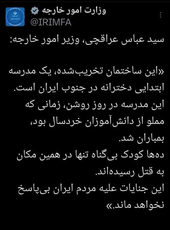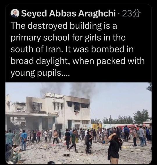 突发新闻——赛义德·阿巴斯·阿拉格齐,伊朗外交部长: “这座被摧毁的建筑,是伊朗南部的一所女子小学。该校在光天化日之下遭轰炸,当时校内满是年幼的学生。” “仅此地一处,就有数十名无辜儿童惨遭杀害。” “这些针对伊朗人民的罪行,绝不可能逍遥法外。” 消息来源——伊朗外交部官方账号