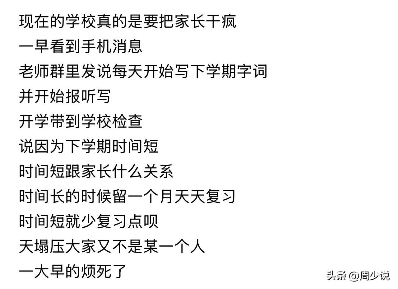 “现在的学校真是要把家长干疯!”近日,一位家长的吐槽,引发热议。一大早,这位家长就被班级群的消息扰得心烦意乱:老师突然通知,要求孩子每天提前写下学期的字词,还要天天报听写,开学后统一检查,给出的理由竟是下学期课时紧张。 这话让家长瞬间无奈又崩溃:学期时间短,本该是学校合理规划教学,怎么反倒把压力全甩给了家长?平时假期长的时候,作业堆成山天天复习,现在时间紧,就不能适当调整,非要让孩子超前学、家长跟着熬? 这番吐槽一出,很快引来大批家长共鸣。有网友直言:“太真实了,现在的家长不光要上班,还要当全职家教,学校一点压力都能变成全家的负担。” 也有家长感慨:“不是不配合教学,只是这种一刀切的安排,真的太让人喘不过气。” 在周少看来,教育的核心从来不是超前赶进度,更不是把教学压力转嫁给家庭。学校和老师的初衷,或许是想让孩子提前打好基础,但忽略了家长的精力、孩子的接受能力,反而会适得其反。 其实,学校做好本职教学,家长做好陪伴引导,彼此分工清晰、互相体谅,才是良性的教育模式。一味把课业压力压给家长,不仅会消耗亲子关系,也会让孩子对学习产生抵触。 教育也从来不是单方面的施压,而是家校携手的温柔同行。少一些形式化的超前任务,多一些贴合实际的安排,让教育回归本该有的样子,也能让家长和孩子,都少一点疲惫,多一点从容。 对于这样的现象,大家怎么看呢?#寻美三湘# #周少说教育#
