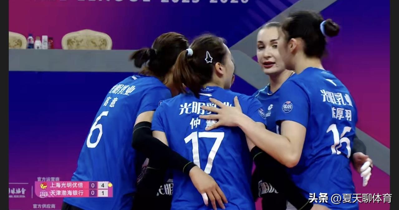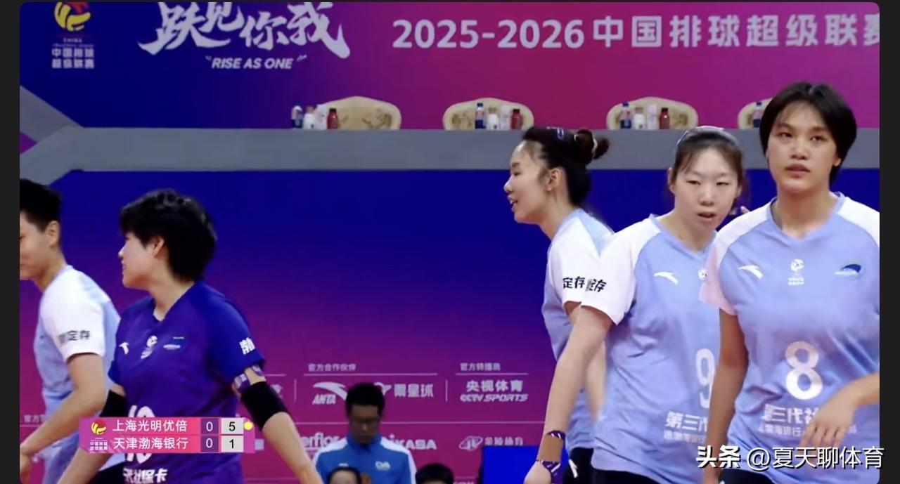 万众瞩目的津沪女排焦点大战!上海女排主场迎战天津女排,天津女排这场让阵容大变阵,半替补阵容出战,外援娜塔莉娅休战,主攻线王艺竹搭档刘美君,副攻张世琦和小马丁内兹,接应上的是李响,二传朱航霆,自由人孙婉鋆,上海女排依然是最强首发阵容出战,仲慧搭档沃龙科娃,高意搭档陈厚羽,许晓婷,范赖克,自由人王唯漪!第一局上海女排上来6-1领先天津,天津这边请求暂停!