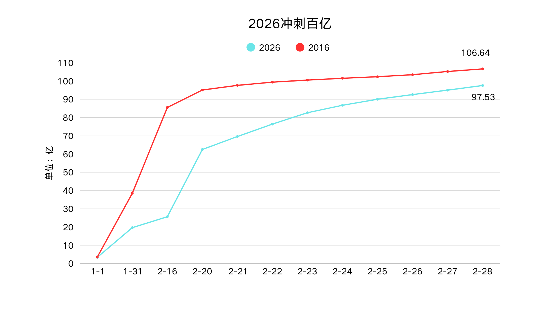 今年成了2016年之后正常营业年份里唯一一个前两个月累计票房没过百亿的,只怪2月只有28天,老天爷全责