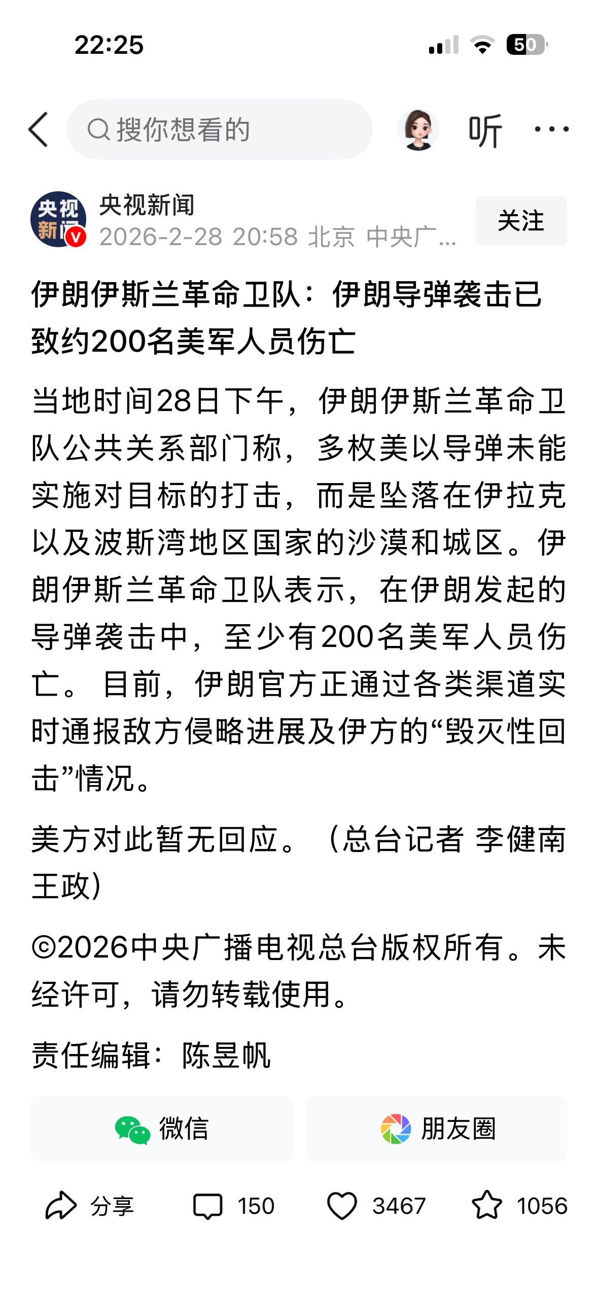 央视报道了伊朗对周边国家美国军事基地的报复,导致了美国出现200人伤亡的战果。 这一消息让伊朗更有决心让美国和以色列付出更惨重的代价。 消息还没有得到美国方面的证实,这些估计会是一场糊涂帐,真实情况将迷雾重重。