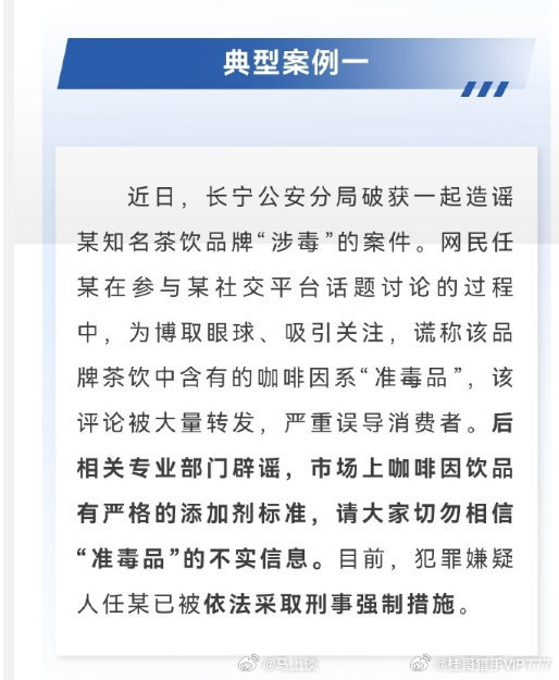 网民任某在参与某社交平台话题讨论的过程中,为博取眼球、吸引关注,谎称该品牌茶饮中含有的咖啡因系“准毒品”,该评论被大量转发,严重误导消费者。