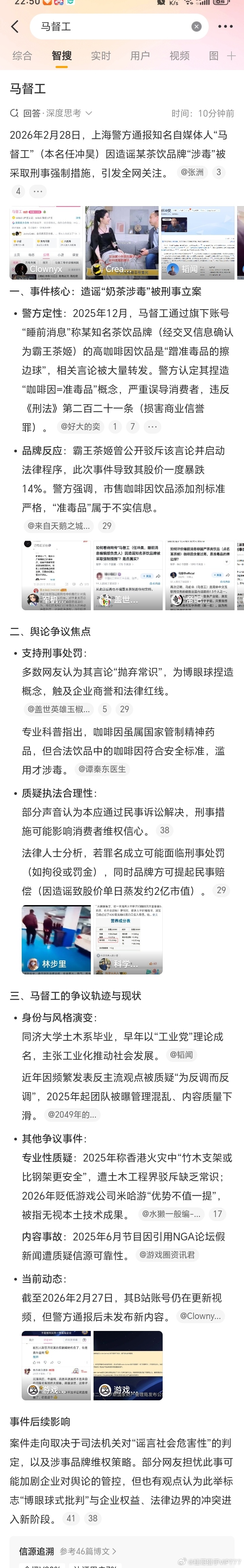 桂哥评:这个马督工(睡前消息),后面没怎么关注了,好像有问题了,这不,果然... 这种造谣,简直了... 咱天天喝咖啡,靠咖啡因续命呢... 咖啡因,全球饮品里都没问题,它独造谣某饮品真可笑!===马督工被抓了!因为造谣霸王茶姬奶茶是准毒品,被警方采取刑事强制措施了…