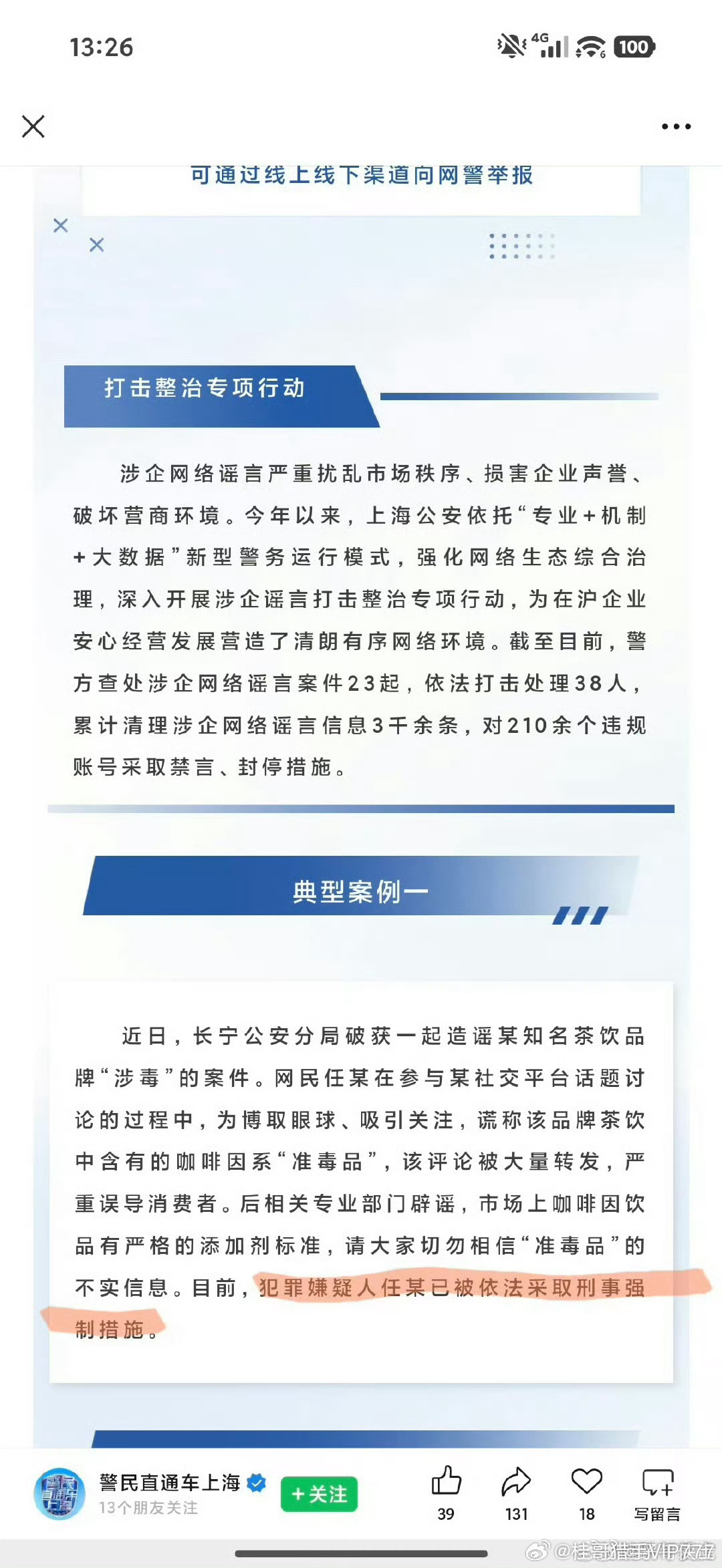 上海网警:“近日,长宁公安分局破获一起造谣某知名茶饮品牌“涉毒”的案件。