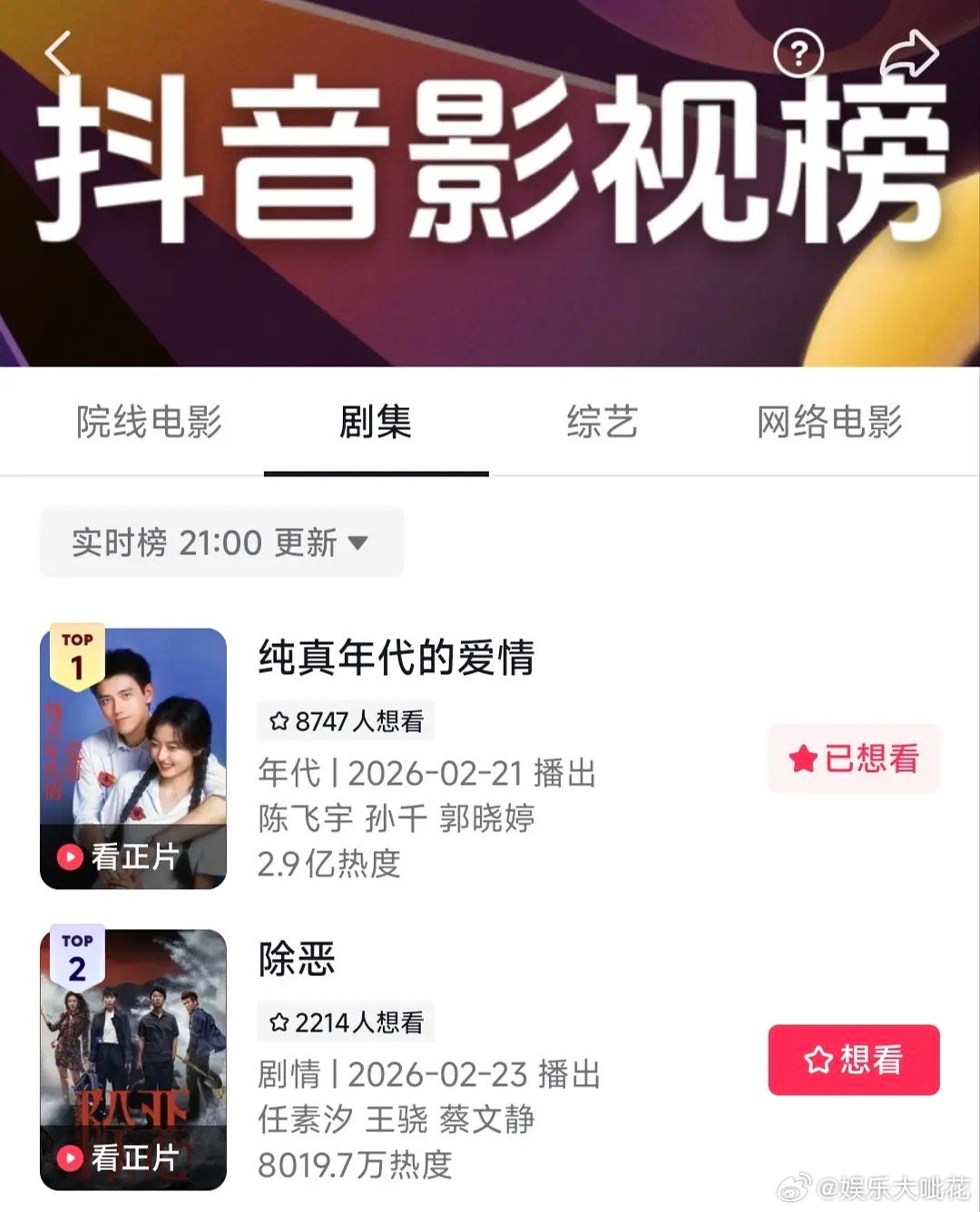 陈飞宇孙千纯真年代的爱情抖热度破2.9亿了!目前所有数据都对得上诶这也真的水不了吧,就是播的很好吧
