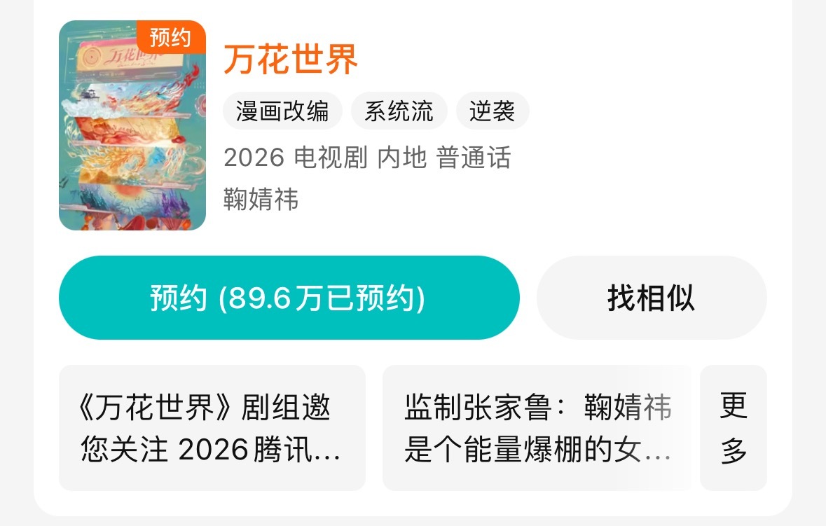 wok,鞠婧祎《万花世界》在没开拍,没物料的情况下预约量马上破90万了,橘丝太疯狂了❗️