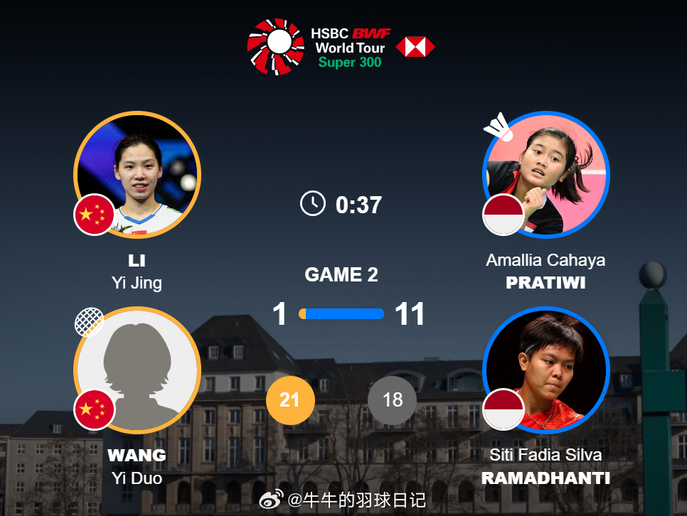 女双 半决赛 李怡婧/王漪朵 21-18 阿玛莉亚/拉马丹蒂2026年德国羽毛球