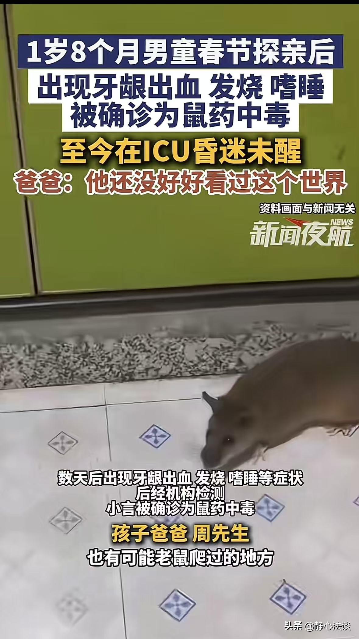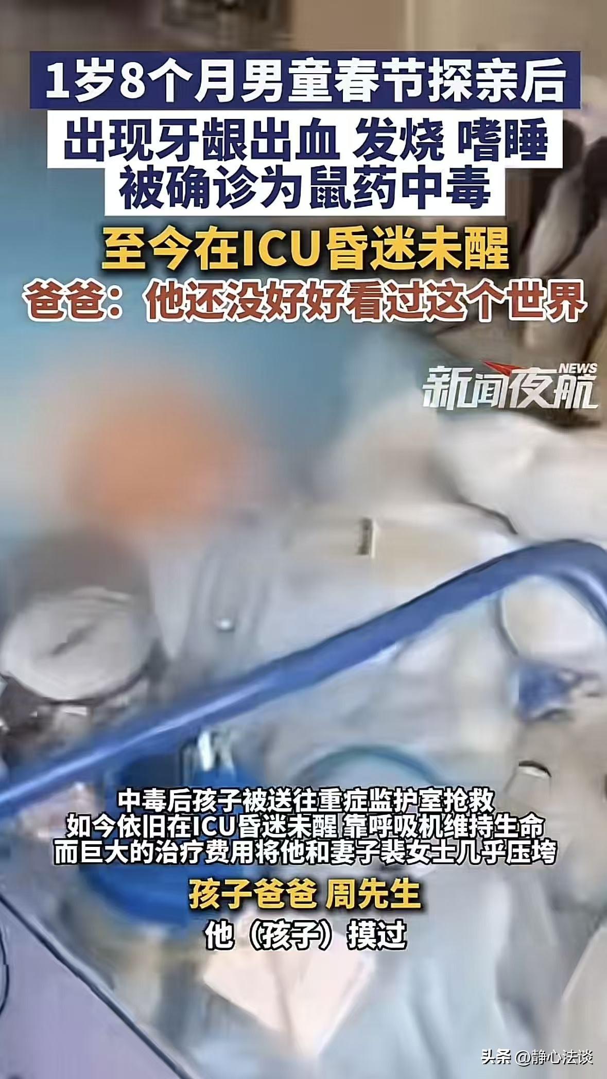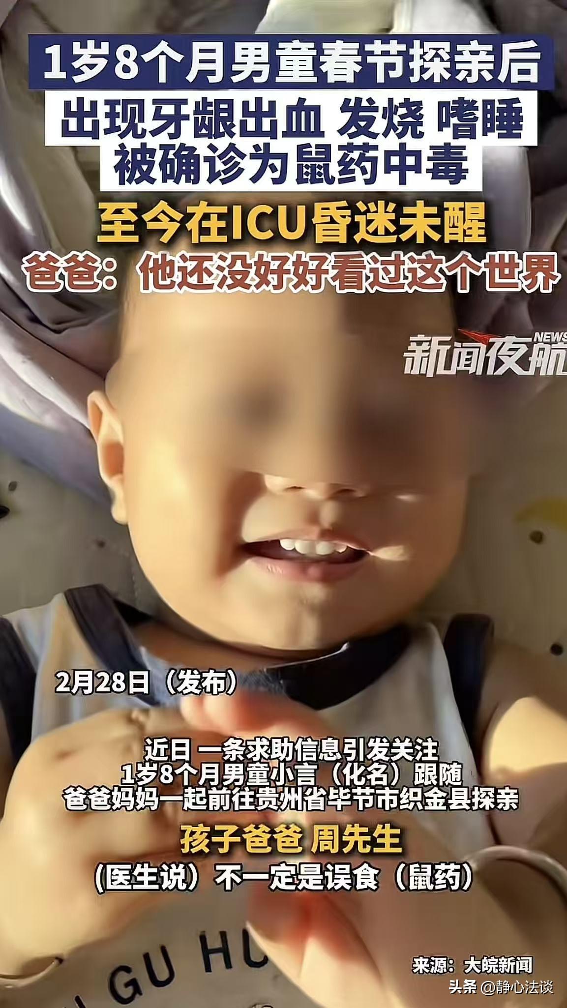 “太可怕了!”贵州毕节,男子带1岁8个月大的宝宝探亲,结果回家后就开始高烧、出血、直最后接昏迷,男子吓坏了,赶紧把孩子带到医院,直接被送进ICU,经查孩子是鼠药中毒,可男子一头懵,他实在是想不出是在哪中的毒,现在孩子靠呼吸机续命,孩子父母现在整天以泪洗面,这么小的孩子遭这么大的罪,他甚至还没有好好看过这个世界。网友:太蹊跷,赶紧报警,人心隔肚皮,难保有人故意为之! 周先生带着妻子和刚满1岁8个月的儿子,回老家走亲戚,原本开开心心的探亲之行,竟成了一场挥之不去的噩梦。 刚开始出事的时候,谁都没当回事。 1月24号那天,周先生和妻子突然发现宝宝嘴角有一点点血丝。 大家都以为是孩子长牙,牙床痒,自己咬破的,随便擦了擦就过去了,压根没往坏处想。 可没过多久,孩子紧接着开始发高烧,小脸烧得通红,精神越来越差,一家人这才慌了神。 2月21号,他们把孩子带到贵阳市妇幼保健院,一抽血,结果直接把全家吓傻了: 血液里溴鼠灵浓度高达31.4ng/ml,明确是鼠药中毒! 更可怕的是,中毒已经引发了颅内出血、脑疝、中枢性呼吸衰竭。 最严重的是脑水肿,孩子直接进了重症监护室,一躺就是好多天,全靠呼吸机维持生命。 周先生坐在走廊的长椅上,他想不明白,好好的孩子,怎么会中鼠药? 两口子翻来覆去回忆,探亲那几天,他们带孩子去过邻居家、逛过古镇、走过商业街。 但全程看得紧紧的,从来没见过、没碰过任何鼠。 实在想不通孩子是怎么沾到毒的,至今一点线索都没有。 可比病情更让人难受的,是这个家的难处。 周先生就是最普通的打工人,妈妈全职在家带娃,没有收入。 孩子一住院,前期治疗费像流水一样,家里所有积蓄全花光了,还到处借钱,欠了一屁股债。 实在走投无路,他们在网上筹发起了30万的求助。 好在世上还是好人多,截至2月28号,已经有1821位好心人伸出援手,一共捐了44920块钱。 可这点钱,对于天价治疗费来说,还是远远不够。 现在,周先生和妻子每天守在ICU门外,以泪洗面,一步都不敢离开。 周先生红着眼睛说,孩子才一岁八个月,还没好好看过这个世界。 还没好好叫过一声爸爸妈妈,怎么就遭这么大的罪? 但他表示,只要自己还有一口气,他就会想办法给儿子治病。 身为父亲,他无法眼睁睁看着儿子就这么离开,哪怕只有一丝希望,他也不会放弃。 后来这事在网上传开了,评论区一下就炸锅了! 网友们直接坐不住了,好好的孩子,平白无故中了毒,实在不合常理。 纷纷留言提醒:这事绝对没表面那么简单,细思极恐。 赶紧报警彻查,人心隔肚皮,难不保是有人故意为之,必须查清楚,不然太可怕了! 《刑法》第114条:放火、决水、爆炸以及投放毒害性、放射性、传染病病原体等物质或者以其他危险方法危害公共安全,尚未造成严重后果的,处三年以上十年以下有期徒刑。 《刑法》第115条:投放危险物质致人重伤、死亡或者使公私财产遭受重大损失的,处十年以上有期徒刑、无期徒刑或者死刑。 鼠药属于明确的毒害性物质,不管是故意投毒害孩子,还是在公共场所乱放鼠药导致孩子中毒,都是在犯罪。 直到现在,孩子还在ICU里生死未卜,中毒的真相依旧是个谜。 好好的探亲,怎么会遇上这种事?这么小的孩子,到底是怎么接触到鼠药的? 每一个问题,都扎在心上,一个才来到世界不久的小生命,还没来得及感受世间的美好,就被推到了生命边缘,真的太让人心疼。 对此,你怎么看这件事! @静心法谈 学法辨是非,慬法不吃亏。