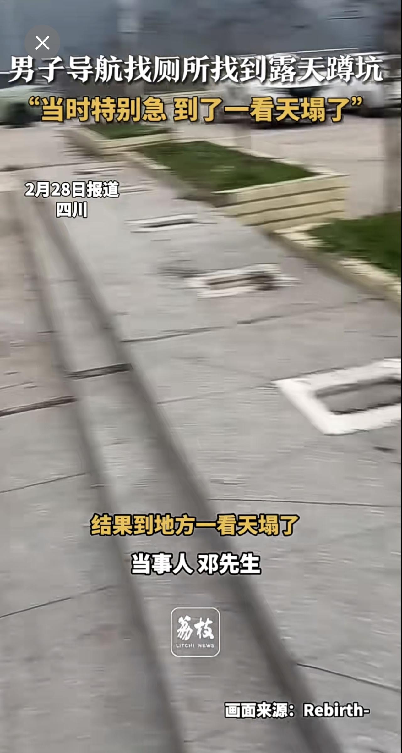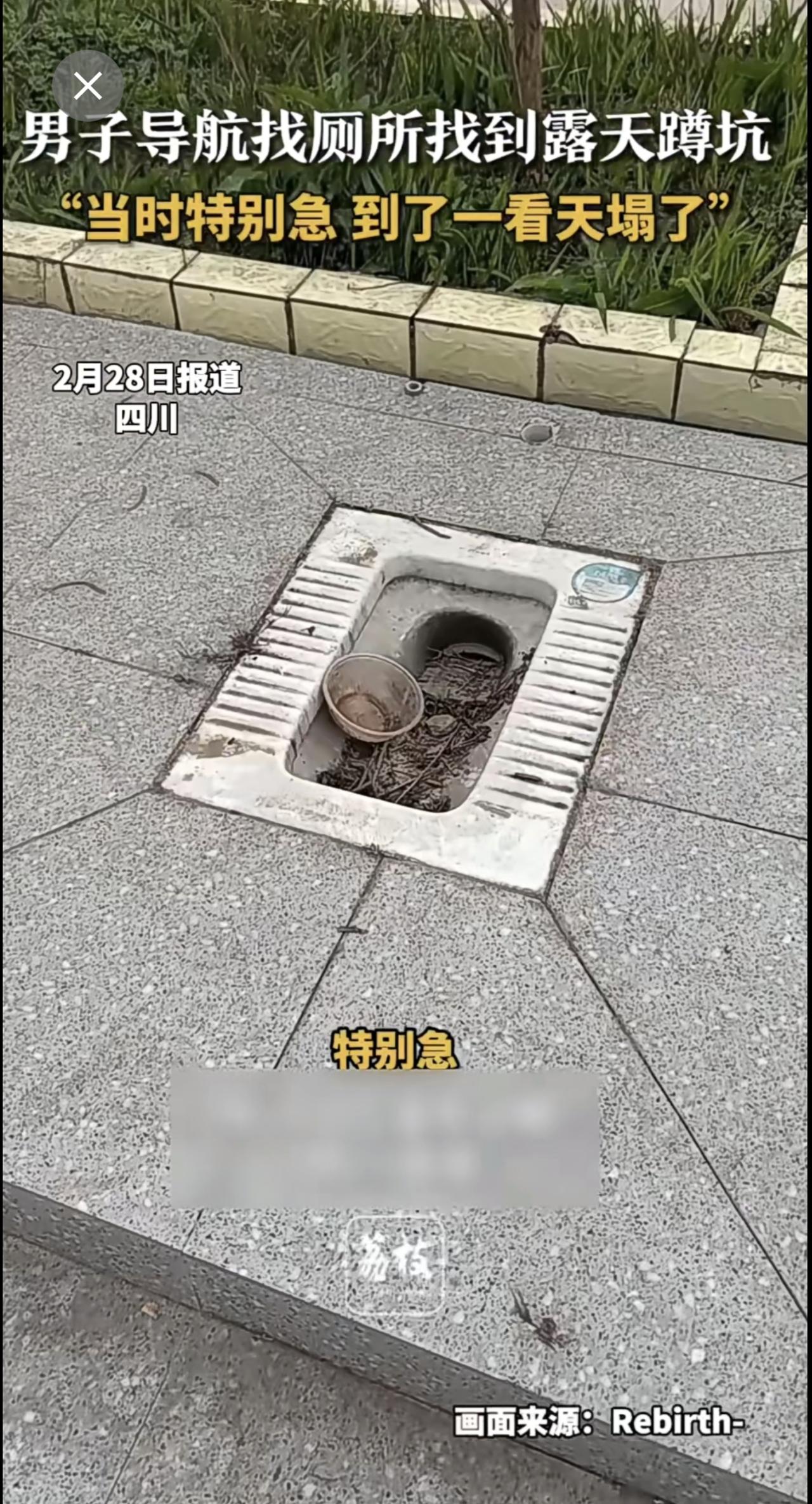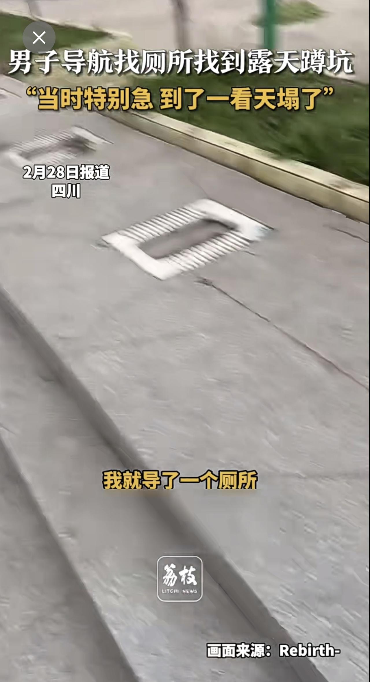 四川一男子导航找厕所,结果导航到了一个露天蹲坑!他说当时特别急,到了一看直接“天塌了”。导航迷惑行为 社死现场 (新闻来源:荔枝新闻|编辑:曲佳桐|初审:郭启迪|复审:范思瑶|终审:刘鹏|校对:周正)
