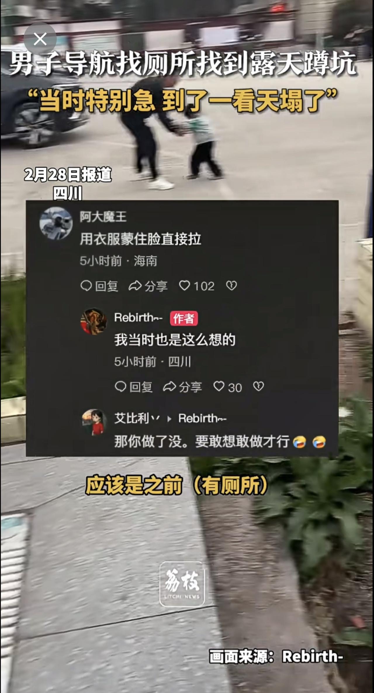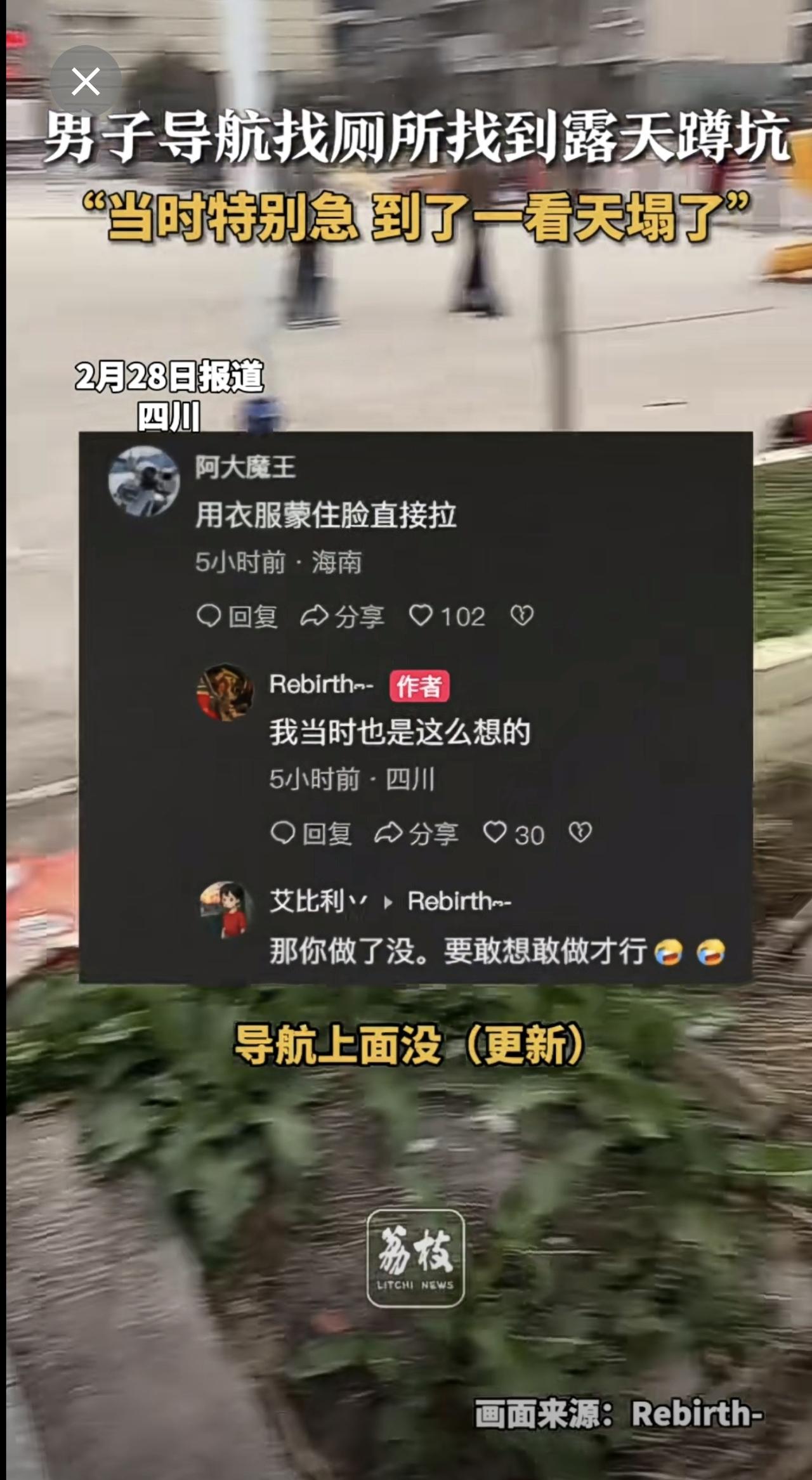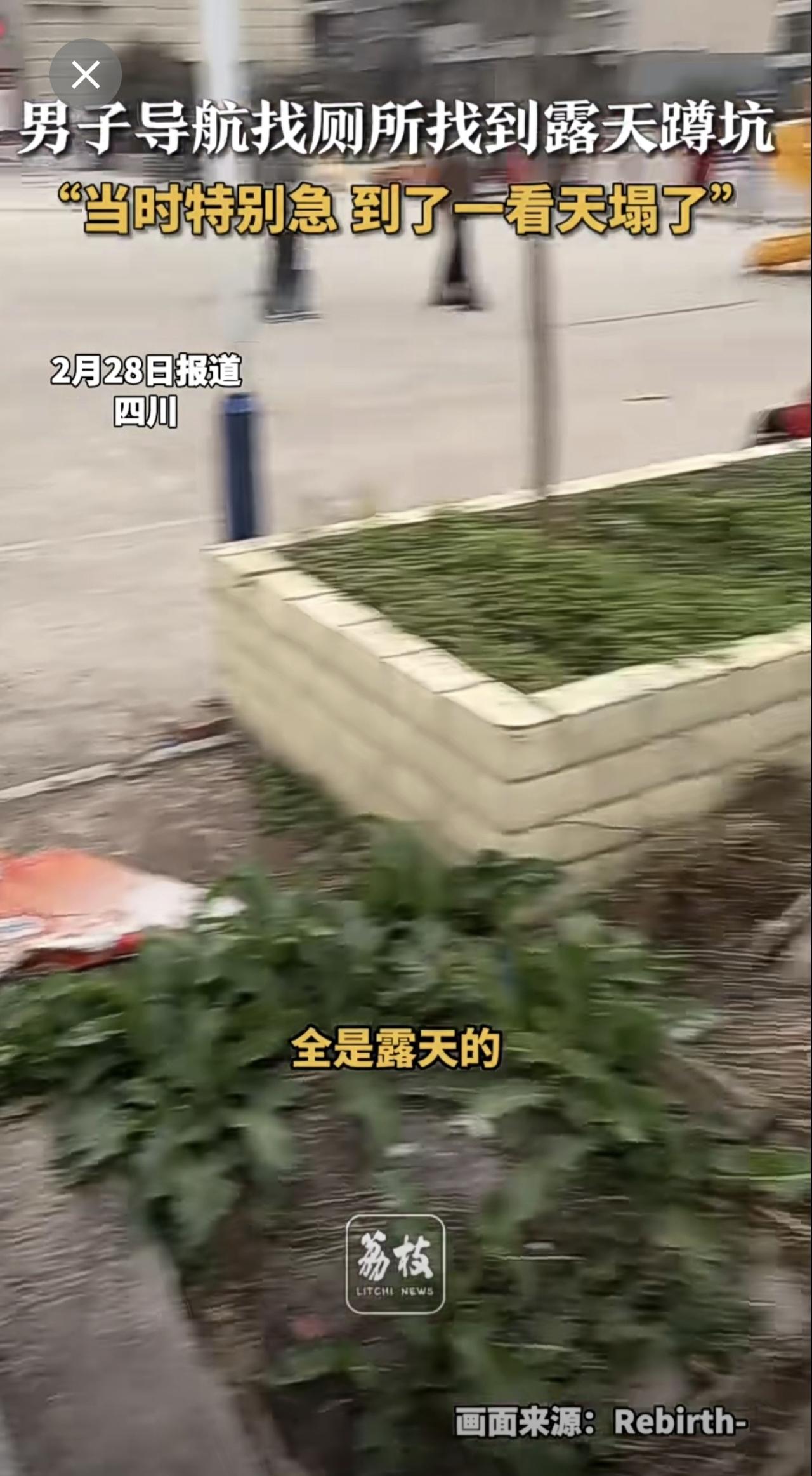 四川一男子导航找厕所,结果导航到了一个露天蹲坑!他说当时特别急,到了一看直接“天塌了”。导航迷惑行为 社死现场 (新闻来源:荔枝新闻|编辑:曲佳桐|初审:郭启迪|复审:范思瑶|终审:刘鹏|校对:周正)