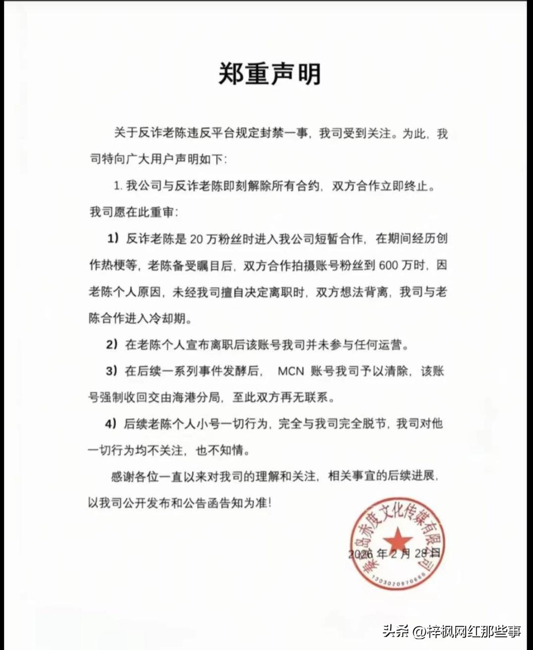 现在的人什么热度都要蹭,老陈账号被封,这个mcn跳出来解释到底是什么意思,既然早就给你没关系,你这一纸声明不是蹭热度吗。 看说明里面这个机构和老陈合作是在老陈上班时候合作的。当时那个反诈账号二十万的时候和和这个机构开始合作。老陈承诺账号运营到粉丝六百万,结果老陈半路辞职,随后这个机构和老陈反诈官方账号解除合作。 说明也说到,老陈离职以后,这个机构和老陈没有任何合作,一切行为都是老陈自己承担。 那么问题来了,既然老陈辞职以后账号和这个机构没有任何合作,你出这一纸说明有何用意,难道不是暗中广告吗,蹭流量吗!