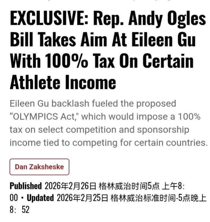 据美媒报道称,独家获悉,田纳西州共和党众议员安迪·奥格尔斯正推动一项法案,背景是针对代表中国参加国际比赛的美国出生自由式滑雪选手古爱琳引发的反弹,包括刚刚结束的2026年冬奥会。 该提案名为《官方限制个人每年获得的体育精神资金法案》。为什么名字这么长又奇怪?这项法案简称“奥林匹克法案”。明白了吗? “任何与外国对手合作的美国人,不仅背叛了我们的国家,还必须被剥夺所有由此获得的利益。这就是为什么我确保国税局收回像Eileen Gu这样的运动员所赚取的每一分钱,“奥格尔斯议员告诉媒体。 奥格尔斯此前在X(前称推特)上发帖暗示,这可能会对像古这样的运动员产生影响。 “Eileen Gu是一名美国出生的滑雪运动员,目前为中国工作。”奥格尔斯发帖说。“那些背叛美国、支持我们对手的人必须受到惩罚。” 根据草案,该法案将对代表“关注外国实体”参加重大全球赛事的美国公民和合法永久居民所获得的某些收入征收100%的新联邦税,该法在法案中以10 U.S.C. 4872(d)(2)中“受保护国家”为由定义。目前名单包括中国、俄罗斯、朝鲜和伊朗。 该法案针对两笔资金。首先,它将对代表关注的外国实体参加全球体育赛事所获得的金额征税。其次,它将对因代表该外国实体竞争而获得的担保付款征税,或作为诱因而获得的。 “全球体育赛事”的定义很宽泛,包括夏季奥运会、冬季奥运会、世界杯、环法自行车赛和温布尔登。它还包括任何个人作为国家代表参加的其他比赛。 该法案将被覆盖个人定义为任何美国国民或合法永久居民。因此,适用范围不仅限于美国公民,也包括绿卡持有者。如果运动员属于这些类别,并且代表受保护的外国参加上述项目,法案旨在几乎扣除该代理所获得的所有收入。 其中一个最大的实际问题是赞助资金将如何被处理。代言合同并非与某一比赛、一场锦标赛或一套国家队服紧密绑定。他们可以通过代理机构、品牌和国际机构获得报酬。法案的措辞试图涵盖与决定代表受保护国家参赛相关的赞助,但并未说明这些关联将如何被证明或执行。 奥格尔斯办公室表示,国税局将通过标准的报告和征收工具执行该税,就像其他联邦税一样。 加州大学伯克利分校的税法专家布莱恩·加勒教授告诉媒体,联邦税率通常没有硬性上限,税法中在某些情况下已经包含了超过100%的罚金税。他说,反对100%征税的最有力宪法论据是声称其功能为过重罚款或惩罚性处罚,而非税收,尽管他补充说,这种挑战可能会面临艰难的斗争。 经济学家斯蒂芬·摩尔,隶属于“释放繁荣委员会”,批评了奥格尔斯的提议。 “这是惩罚性且不必要的。100%税率将不产生任何收入。这对我们的经济政策和外交政策都不利,“摩尔告诉媒体。