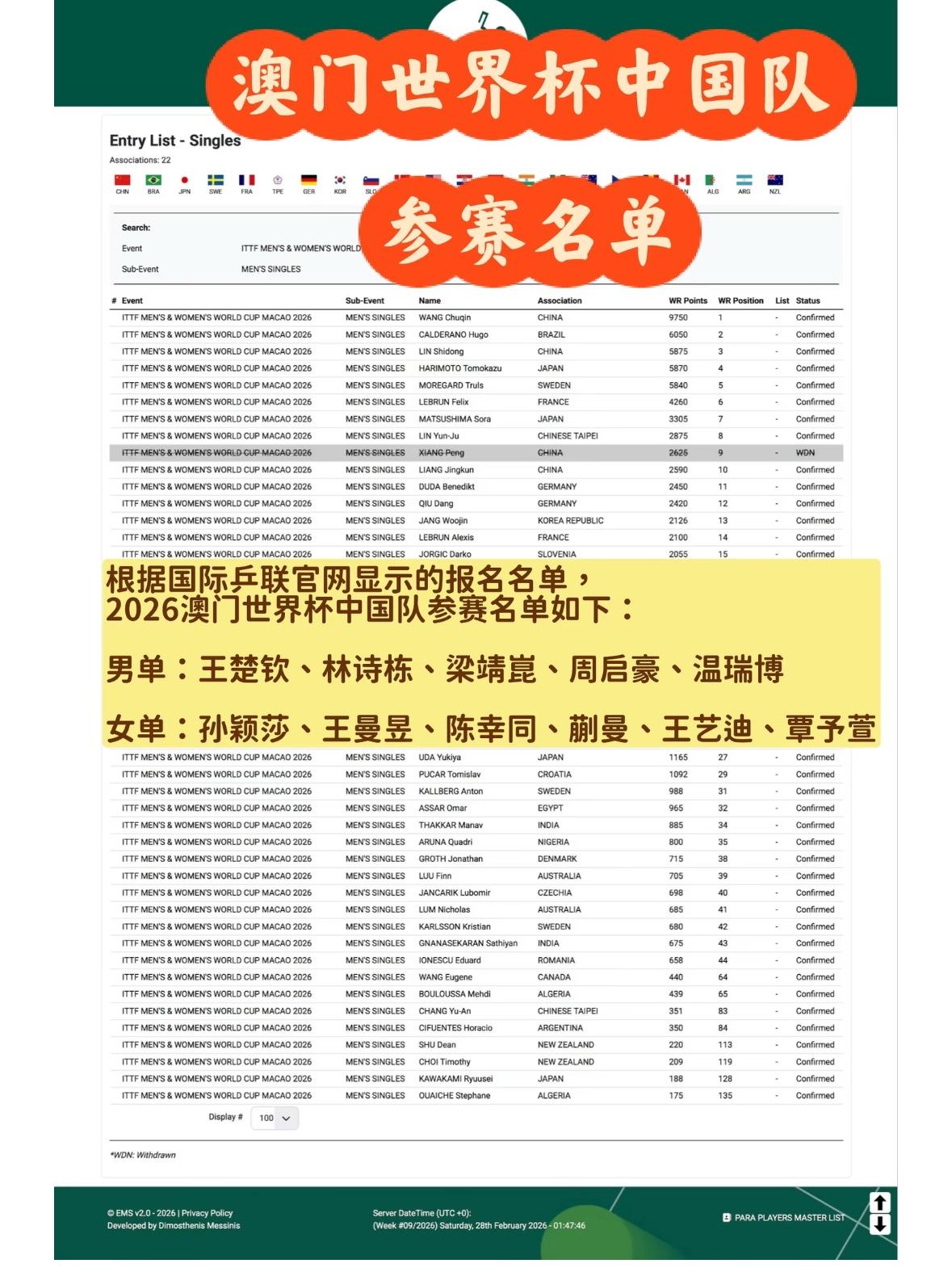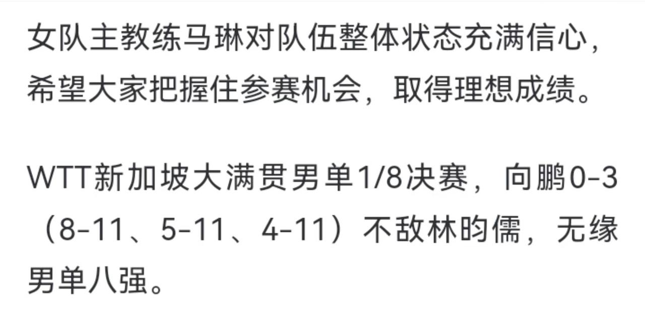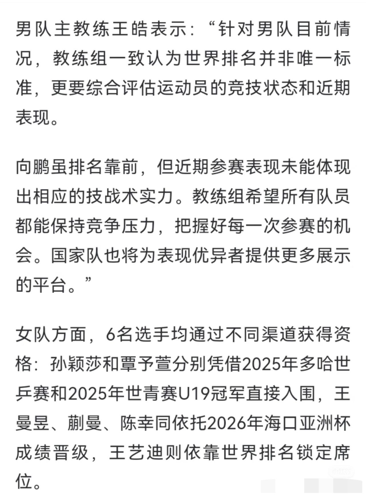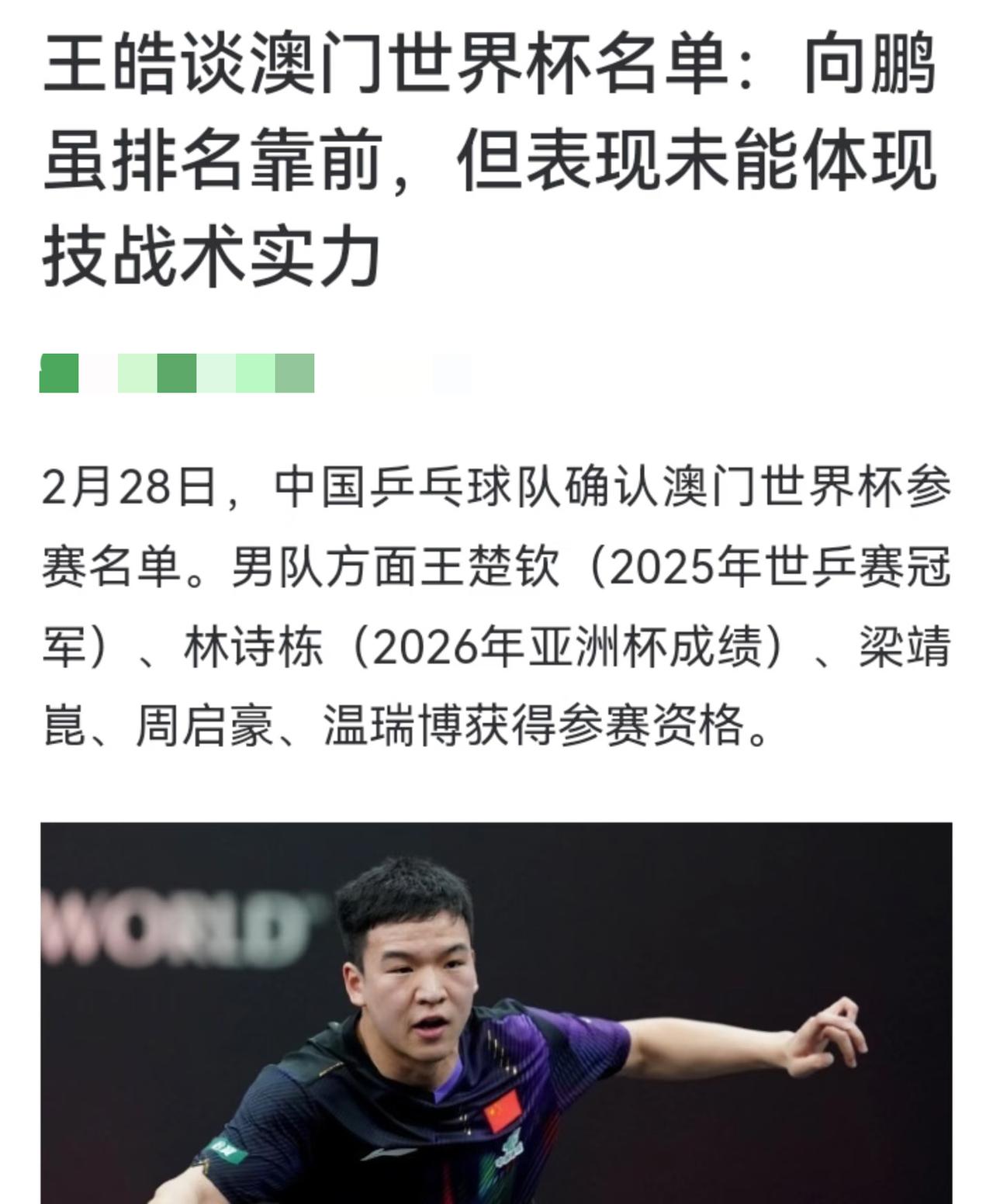 王皓指导谈向鹏没能参加澳门世界杯的原因:排名靠前,但不能体现技战术实力! 2月28日乒协确定了澳门世界杯的参赛名额, 男单:王楚钦 林诗栋 梁靖崑 周启豪 温瑞博 女单:孙颖莎 王曼昱,陈幸同, 蒯曼,王艺迪,覃予宣 王皓指导说针对国乒男队目前的状况,世界排名不是唯一的标准, 要结合运动员近期的实际状态, 向鹏0:3林昀儒,在新加坡大满贯, 是有点说不过去, 其实新加坡大满贯也是考核标准吧, 向鹏给的机会太多, 就在去年拿下一次冠军赛冠军, 我以为他会支棱起来, 实在是太可惜了, 23岁还没有打进主力阵容, 本身就不具备任何优势, 国乒男队除了王楚钦 林诗栋 梁靖崑 以外,周启豪,陈垣宇, 黄友政,向鹏,陈俊菘, 温瑞博其实都差不多, 都是时好时坏, 成绩不稳定, 但最近温瑞博表现出色, 培养小将也无可厚非!