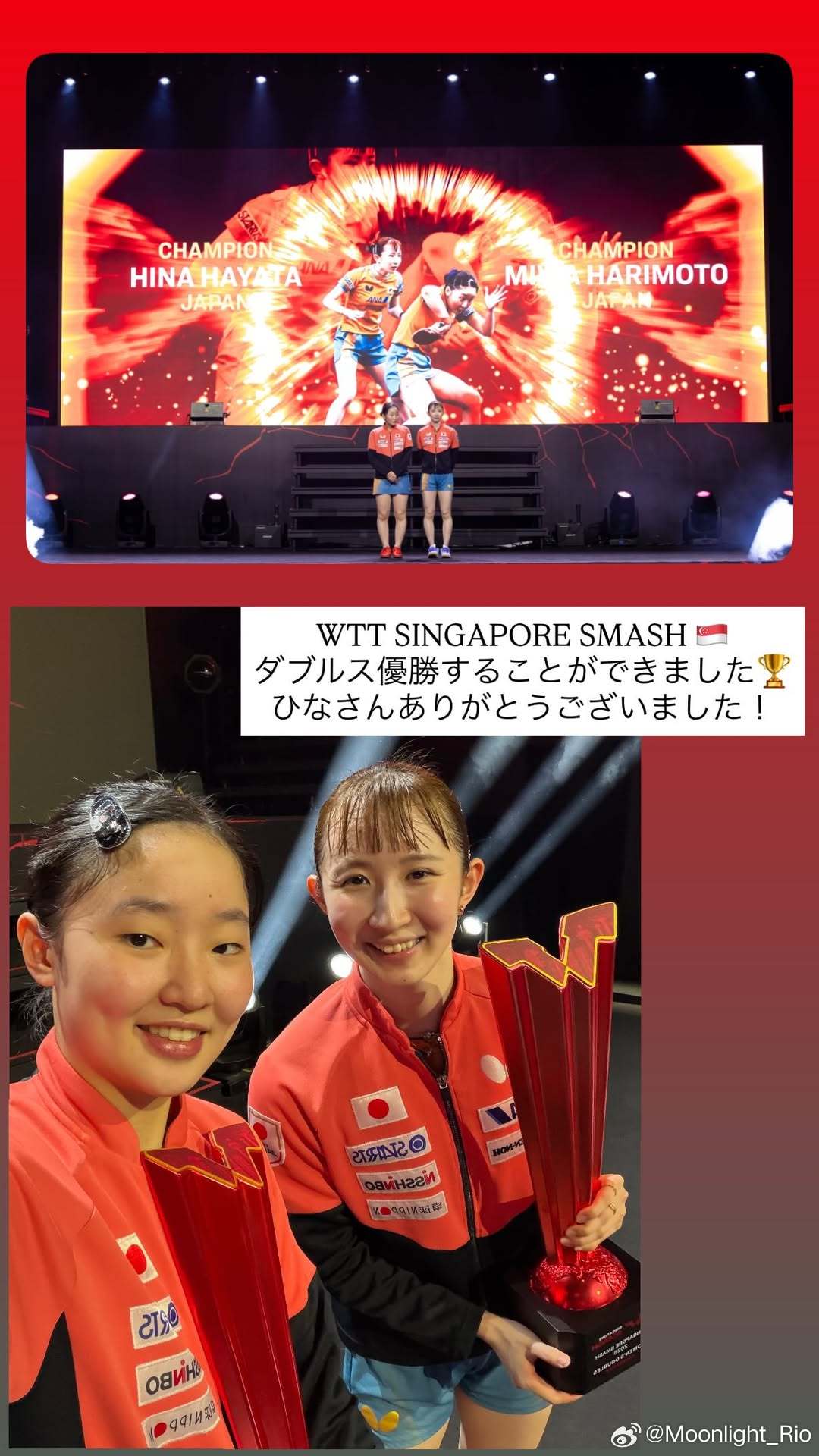 张本美和:WTT新加坡大满贯🇸🇬获得了双打冠军🏆非常感谢Hina!