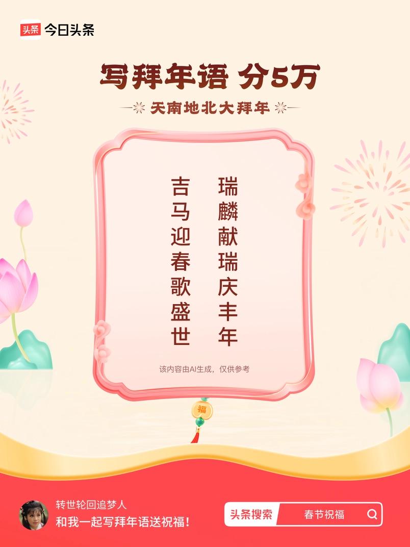 写拜年语送祝福新春拜年送祝福!我的祝福是:“吉马迎春歌盛世,瑞麟献瑞庆丰年”!快来一起写祝福吧戳这里,一起领红包>