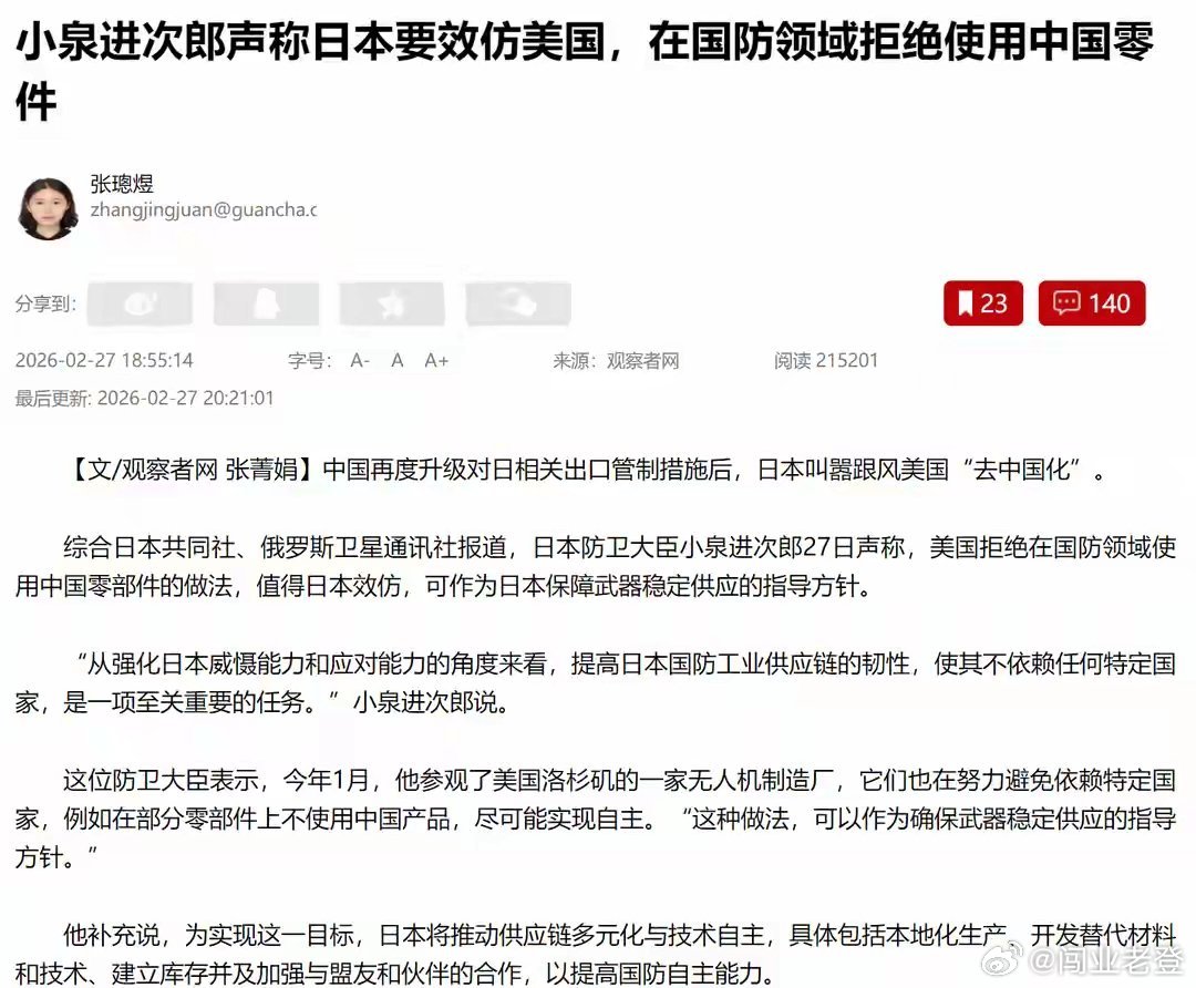 日本宣布反制,将拒绝使用中国零部件小泉进次郎拿着他参观美国无人机制造厂的经历举例,表示美国在国防安全领域拒绝使用中国零部件的做法,日本可以借鉴,以此保障武器的供应稳定。