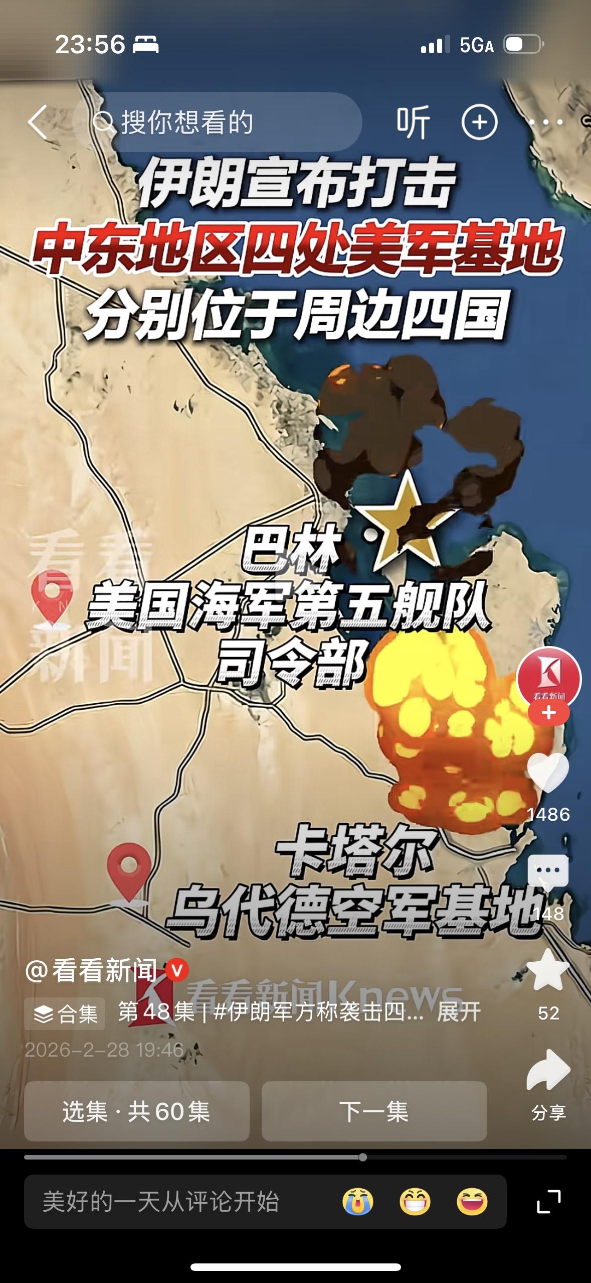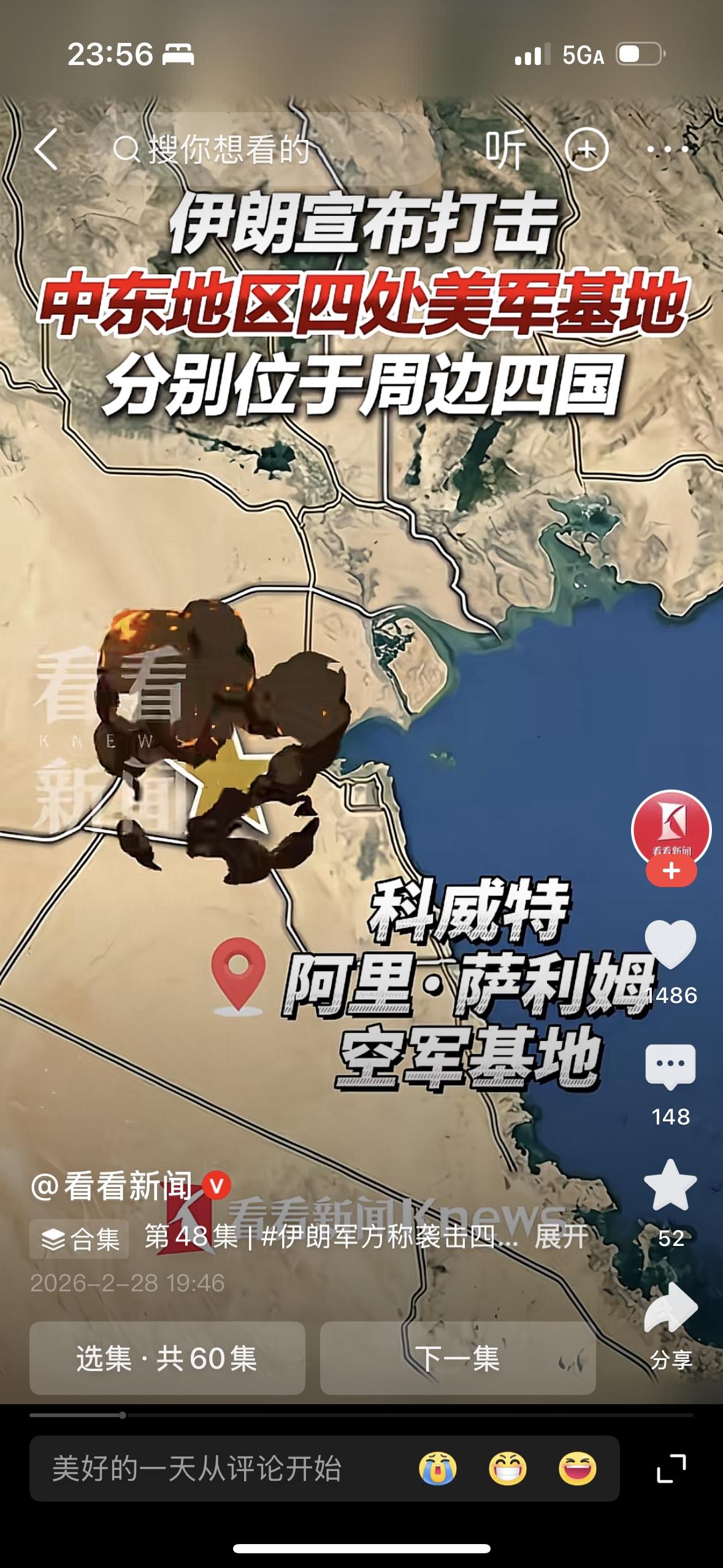 美国被打得措手不及,伊朗宣布空袭了中东的四个美军的军事基地,包括阿联酋的宰夫拉空军基地,科威特的阿里萨拉姆空军基地,卡塔尔的乌代德空军基地,巴林的美国第五舰队司令部。我觉得伊朗除了用导弹攻击以外,应该吸取当年伊拉克被美国人打的教训不能一味的挨打应该出动地面特攻部队打击这四个空军基地,打击美军的空军基地减少这些空军基地的飞机对伊朗的空袭,这是先发制人的手段。或者看鱼肉特种部队采用无人机或者特种攻击摧毁美军的飞机,特别是美军的加油机电子战飞机等高价值目标,还有就是破坏他基地的油库,发电站雷达等重要的军事设施。只有在制造整个中东混乱的情况下,你才有在乱中取胜的可能性。我建议是不要去打以色列,因为以色列离你的距离太远了1000多公里,不要浪费宝贵的远程导弹…..