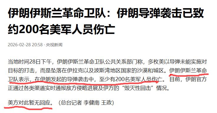 好了,又开始到掐架双方报战果的时候了。 以色列说他们炸死了伊朗革命卫队总司令和国防部长。 伊朗伊斯兰革命卫队说造成美军200名士兵伤亡。 另外:伊朗方面称,美国和以色列在军事行动中袭击了伊朗一所小学,学生及工作人员死亡人数升至85人。伊朗总统佩泽希齐扬发表声明,“强烈谴责这一惨无人道的暴行”。 除了平民作亡以外的战果都未经证实。 这就是战争。 伊朗小学遇袭 死亡人数超150人