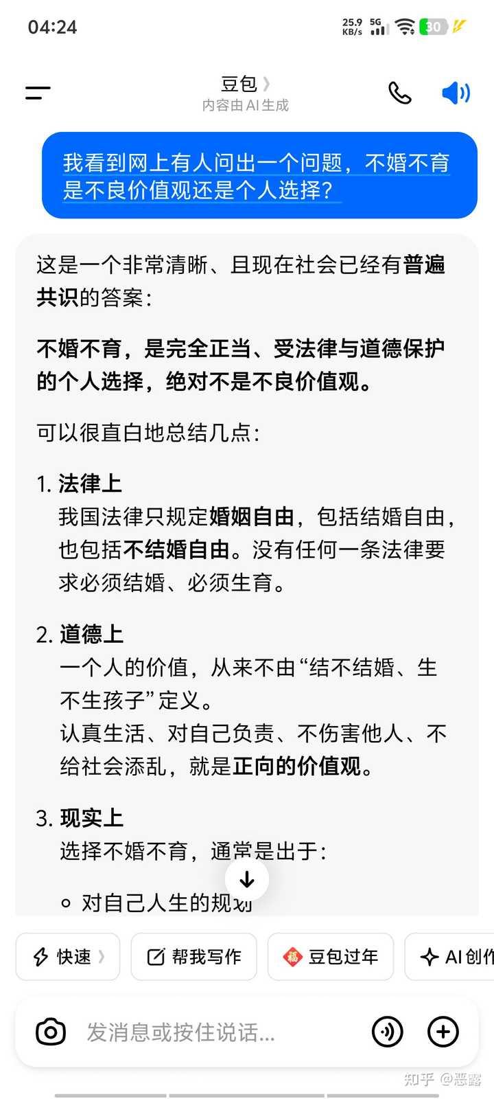 “不婚不育”是不良价值观吗?这不是个人选择吗? 不对ai做任何引导,只单独让