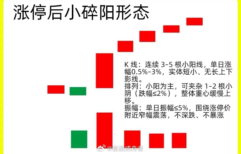 注意了!个股首板涨停后,多数会进入盘整,次日常高开低走进行强势洗盘,洗盘周期通常持续几个交易日。不过,有一种整理形态尤为强势,那就是涨停后的“小碎阳”形态。