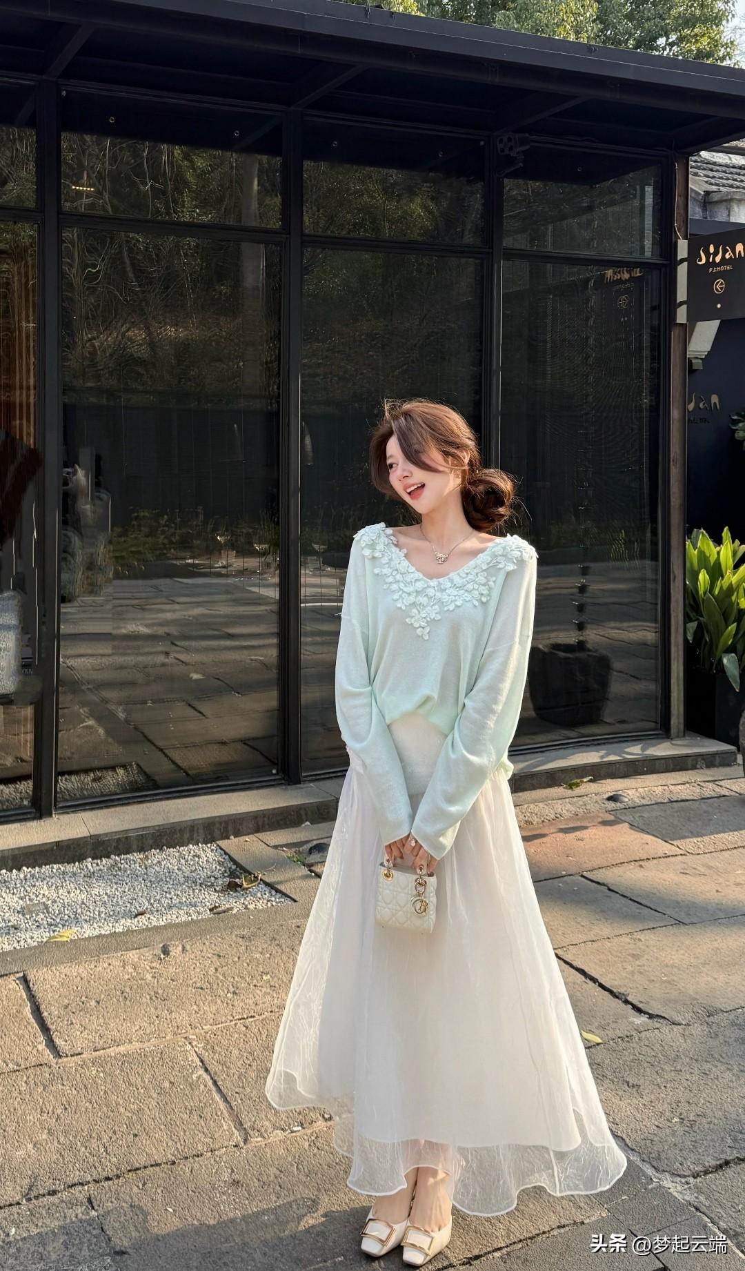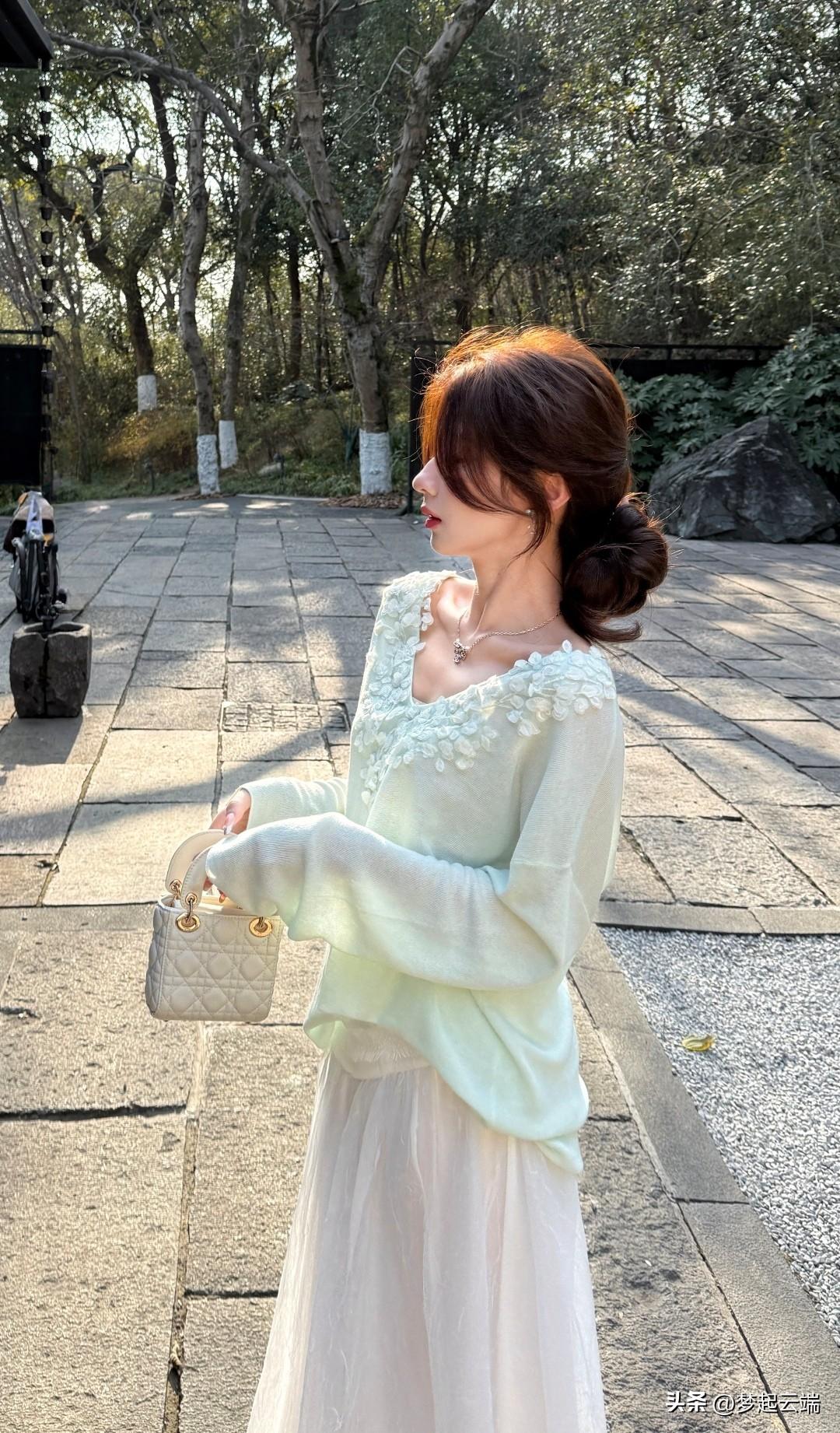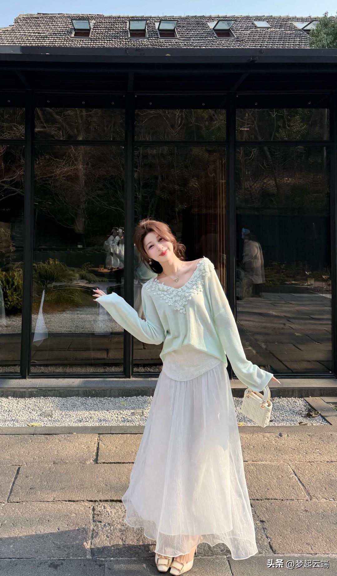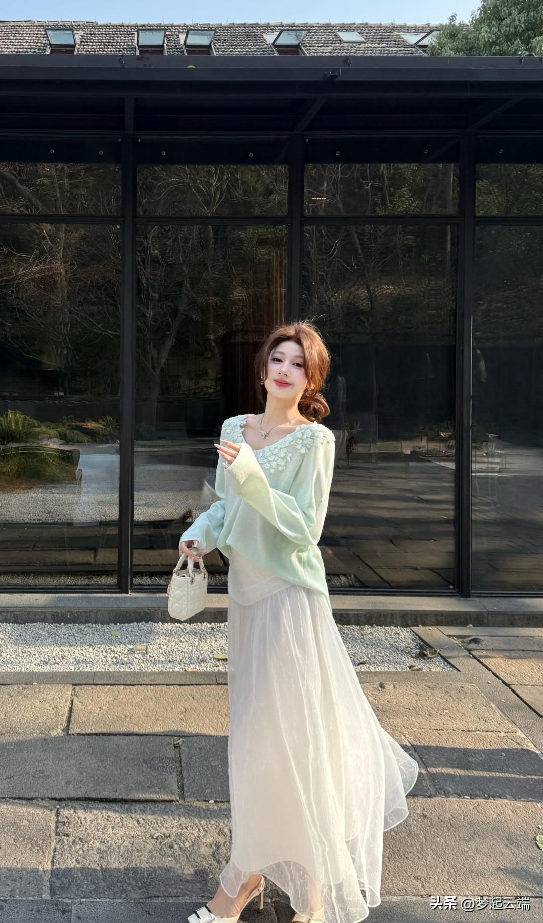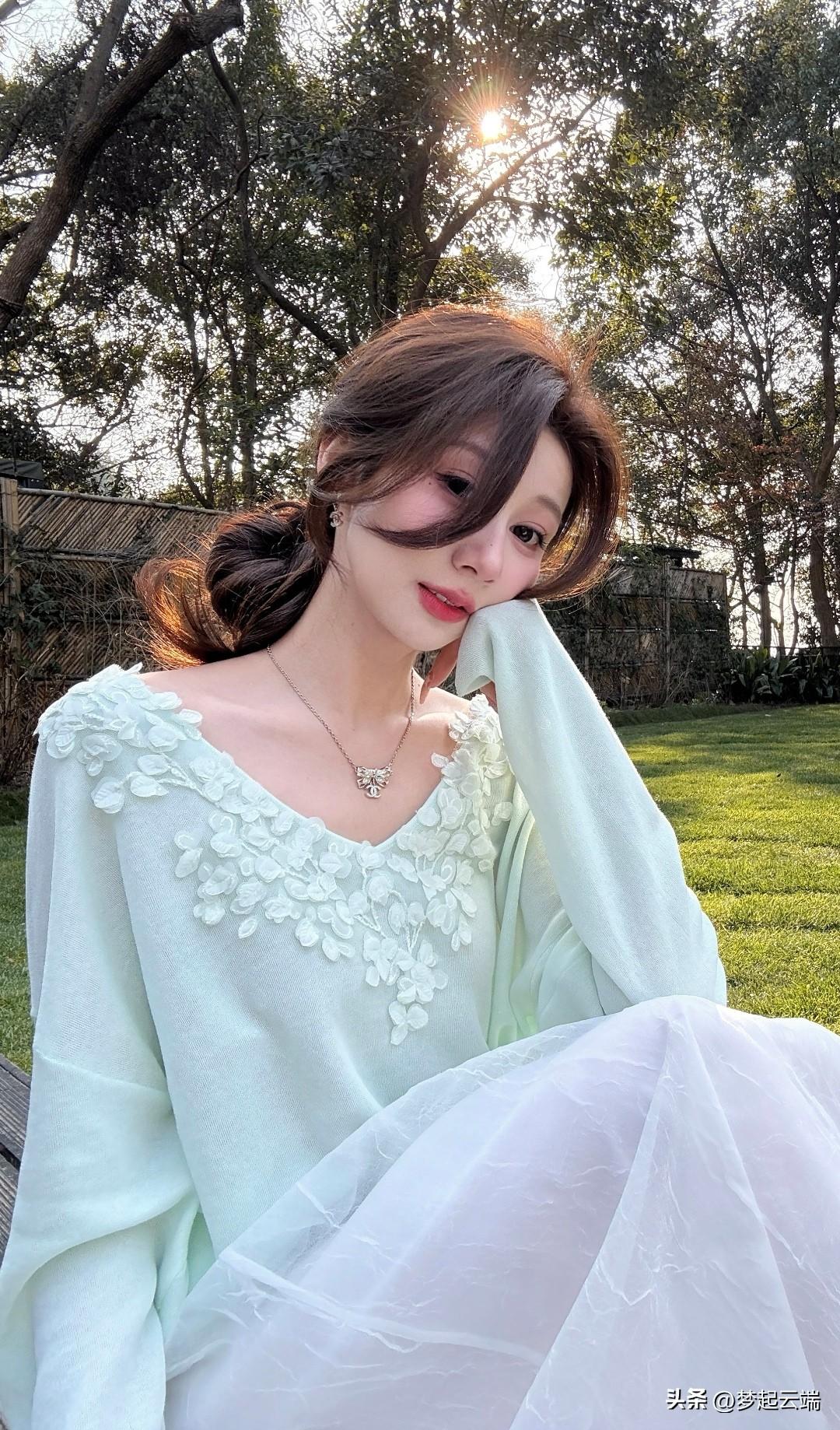 温柔阳光下的梦幻少女,浅绿色连衣裙与白色薄纱裙的完美搭配,尽显优雅与浪漫。