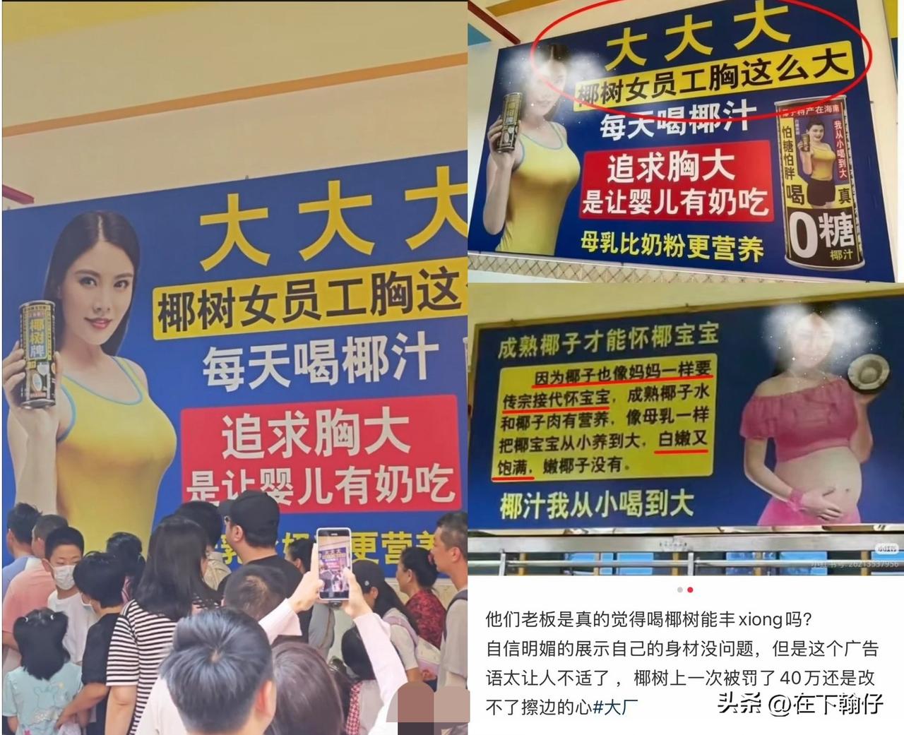 椰树集团在2026年成都春季糖酒会上的展板广告再次引发争议。其宣传文案中出现“追求胸大是让婴儿有奶吃”等表述,将女性胸部大小与哺乳能力进行不当关联,并引用未经科学验证的民俗说法。医学研究表明,泌乳量主要取决于乳腺发育情况,与胸部脂肪量并无直接关联,胸部大小与哺乳能力之间没有科学依据支撑。此外,广告中“成熟椰子才能怀椰宝宝”“椰汁像母乳养大椰宝宝”等延伸文案,也被指出强化了“女性身体为生育服务”的刻板印象。这种营销方式既缺乏对女性的基本尊重,也与科学事实相悖。 这并非椰树集团首次因营销内容引发争议。2024年,该企业曾因官网使用“用椰子擦乳”“南太平洋美女很少飞机场”等广告语被处以40万元罚款;2023年,其直播间因“男模天团”“丰满女主播”等内容多次受到警告。尽管多次受到处罚,该企业似乎将罚款视为营销成本的一部分,甚至有内部声音将罚款称作“广告费”。2025年,其销售额达到50亿元,这种将争议转化为流量的做法,被指以罚款换取关注。 罚了又罚,擦了又擦,把低俗当个性,把擦边当营销,吃相难看。从连续被罚到依然我行我的情况来看,这种营销方式已超出简单“个性”或“直白”表达范畴,呈现出一定的策略性和持续性。利用监管处罚与流量收益之间的不对等,将公众批评转化为品牌热度,这种做法值得商榷。