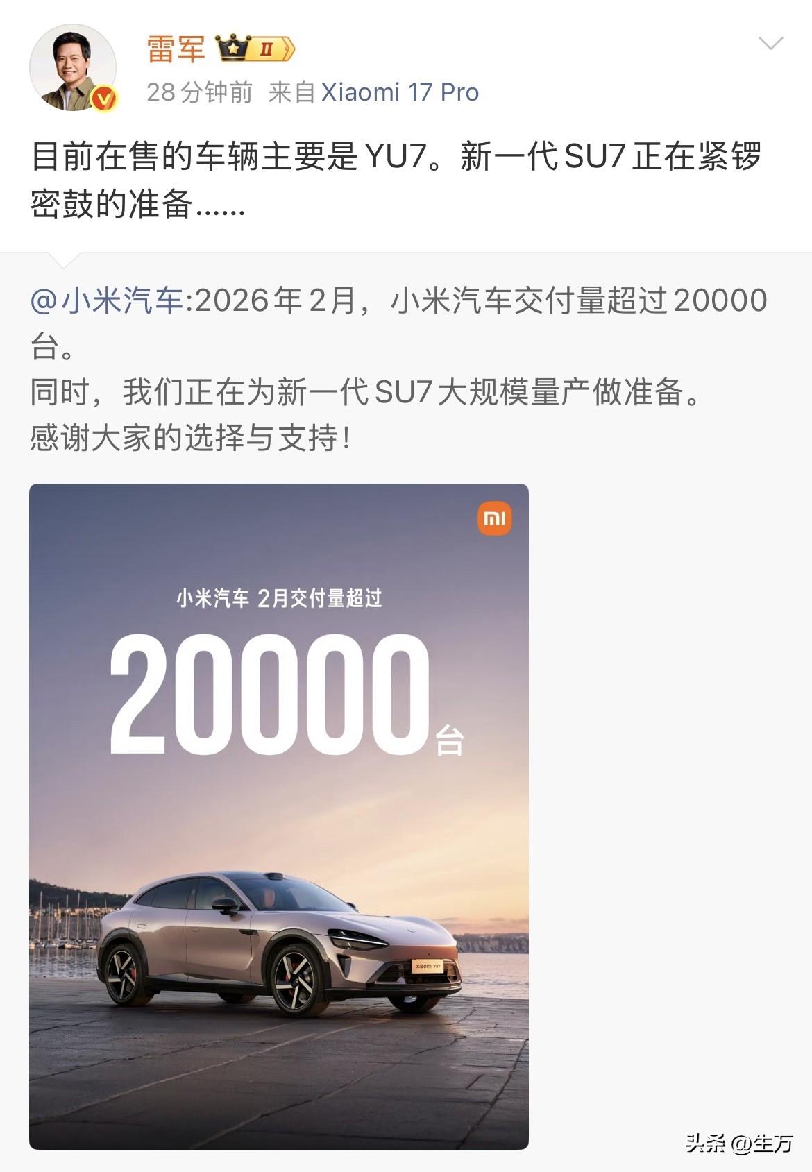 雷军:目前在售的车辆主要是YU7。新一代SU7正在紧锣密鼓的准备! 就在刚才,雷军在社交网络放出了上个月小米汽车的交付量,没想到虽然是过年的二月份,小米汽车的交付量依然超过了20,000台! 而且雷军对这个情况还进行了补充说明,因为他们的上一代小米SU7已经没有销售了,而全新的小米SU7还没有出来,所以上个月借20,000台的销量当中,基本上全部都是上一代的小米YU7。 当然,雷军在最后一上,大家透露,全新一代的小米YU7正在准备当中,那么按照这个节奏来看,估计这个车应该在今年比较快的时间里和大家见面。 要知道这个车才出来一年多的时间,更新版本就来了,可能到时候又会有用户选择换新车,到时候我们看看这两个SUV之间的最大区别是啥。