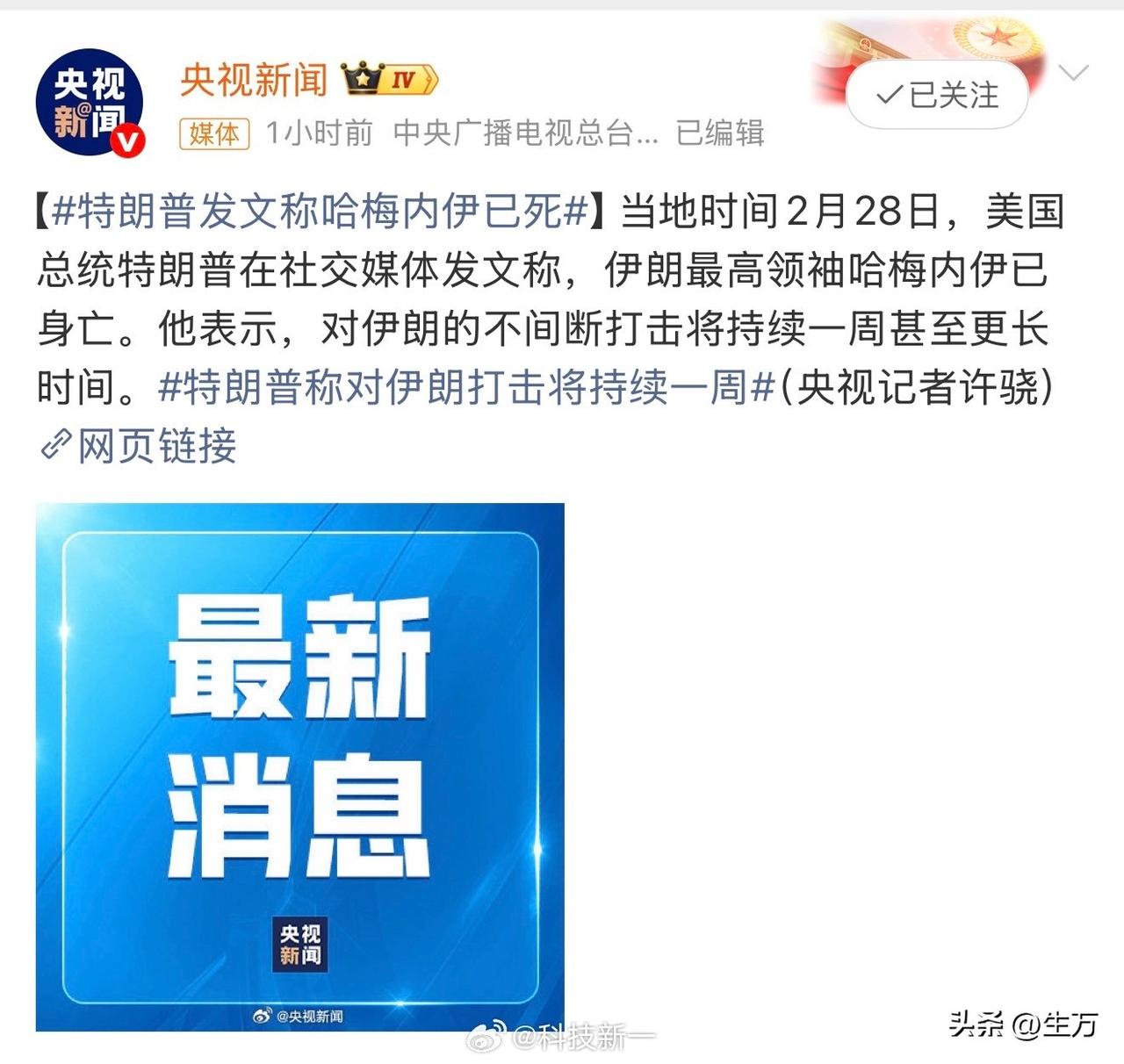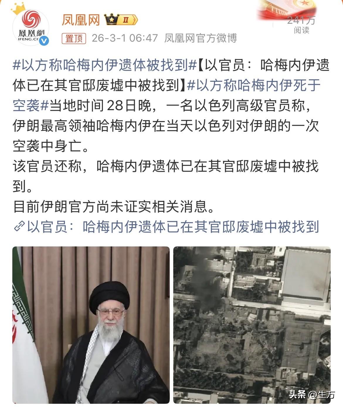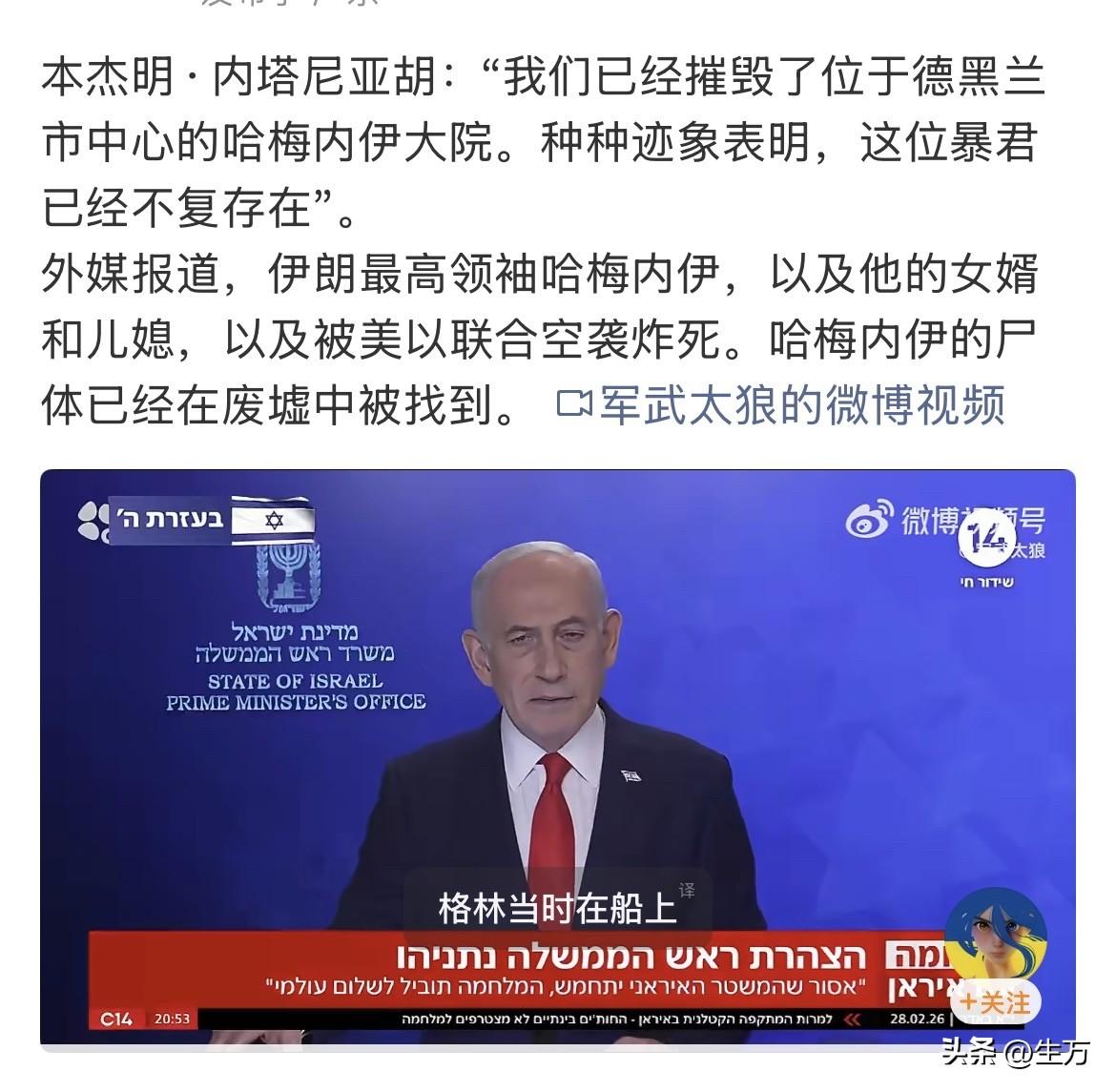 现在导弹这么牛吗?不到一天时间,哈梅内伊就不在了! 综合各个渠道的消息来看,哈梅内伊应该是不在了,因为不管是特朗普,还是内塔尼亚胡,他们都通过社交网络,在确定这件事情。 而且内塔尼亚胡为这个事情还专门录了一段视频,关键现在最新的消息是,后续的进展也跟上了,根据今天早上多家媒体综合的信息来看,哈梅内伊大概率是不存在了。 因为这种事情是不能开玩笑的,如果接下来一两方面发现他又存在了,那么对于特朗普和内塔尼亚胡来说是很尴尬的。 所以这种事情发生之后,看看接下来伊朗方面是怎么回应的,毕竟才打了一天时间,就打成这个样子了,所以接下来他们是要用上昨天说的新武器,还是溃不成军,一切不得而知,看来今天这个事情会有转折,我们拭目以待。