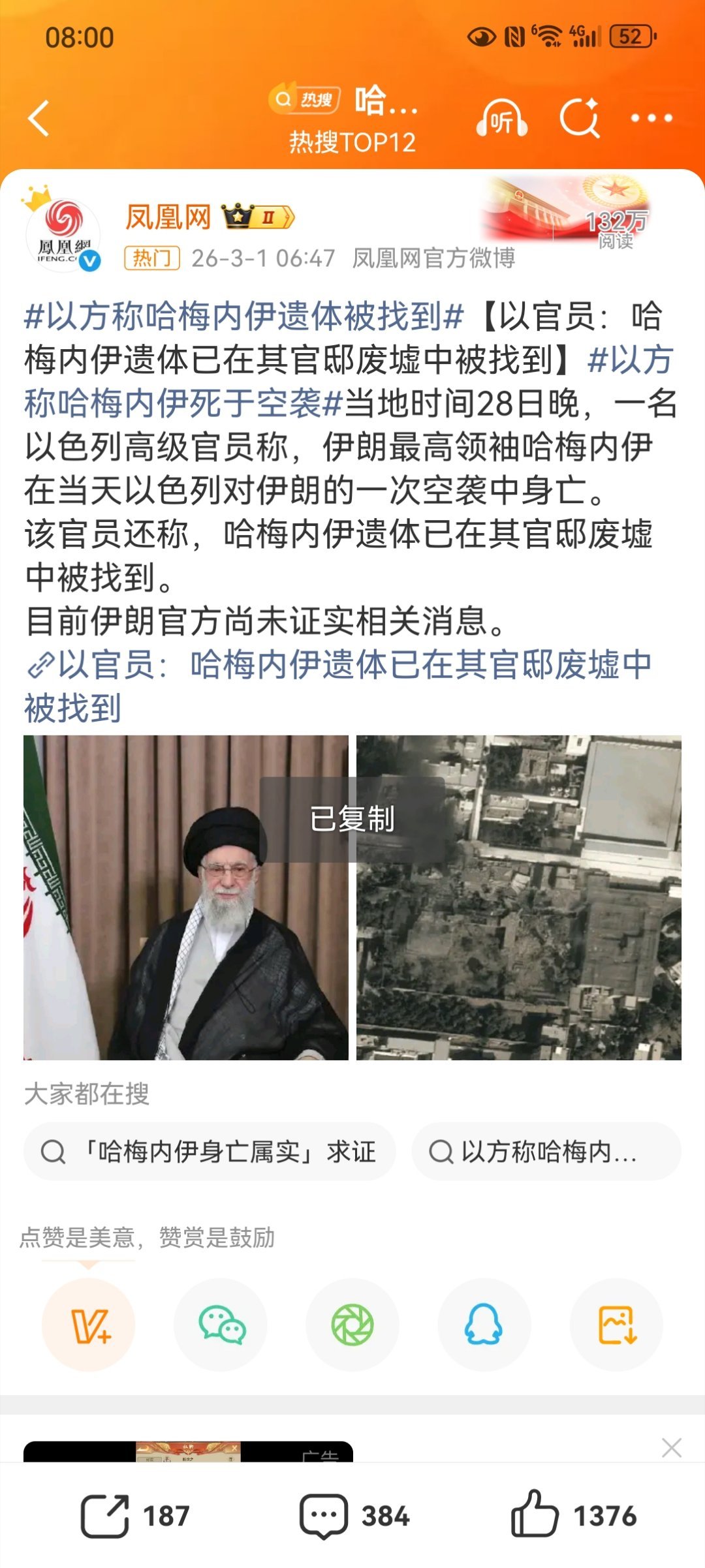 以方称哈梅内伊遗体被找到【以官员:哈梅内伊遗体已在其官邸废墟中被找到】以方称哈梅内伊死于空袭当地时间28日晚,一名以色列高级官员称,伊朗最高领袖哈梅内伊在当天以色列对伊朗的一次空袭中身亡。该官员还称,哈梅内伊遗体已在其官邸废墟中被找到。目前伊朗官方尚未证实相关消息。